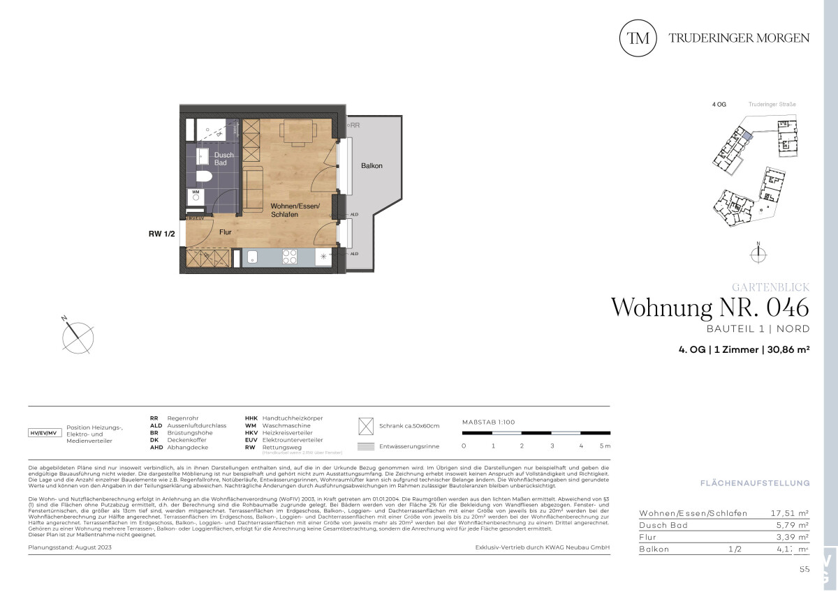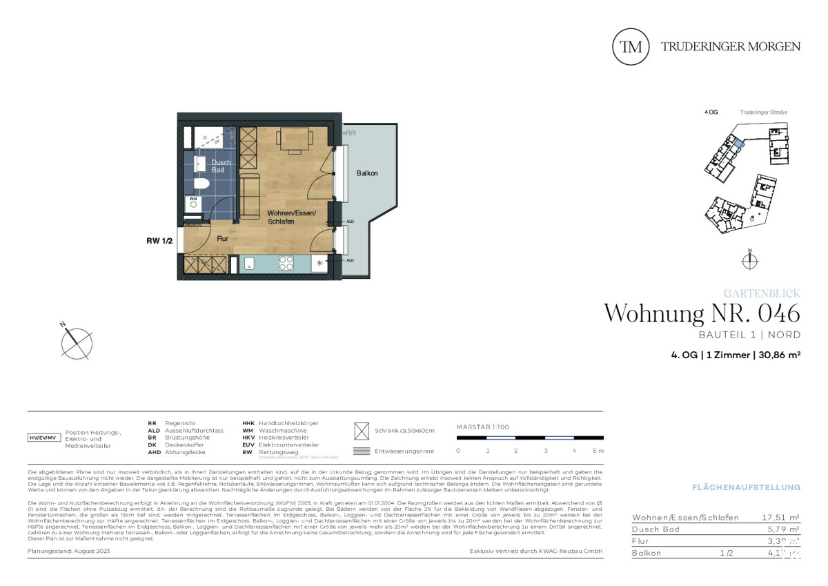 Diese 1-Zimmer-Wohnung mit ca. 30,86 m² Wohnfläche und schönem Balkon befindet sich im 4. OG des Neubauprojekts Truderinger Morgen. Die Räume sind optimal geschnitten und bieten viel Gestaltungsfreiraum. Ein großer Balkon und große, bodentiefe Fenster schaffen viel Helligkeit im Wohn-, Ess- und Schlafbereich. Echtholzparkett im Wohnbereich, große Fliesen im Duschbad, elektrische Rollläden, Fußbodenheizung und Tiefgaragenstellplätze mit optionaler E-Ladestation sind nur einige der Vorzüge für den hochwertigen Wohnraum. Ergänzt wird der hohe Wohnkomfort mit einer optimalen Anbindung und einer ausgezeichneten Infrastruktur für Alltag und Freizeit inmitten des modernen, urbanen Flairs des aufstrebenden Stadtteils im Münchner Osten.