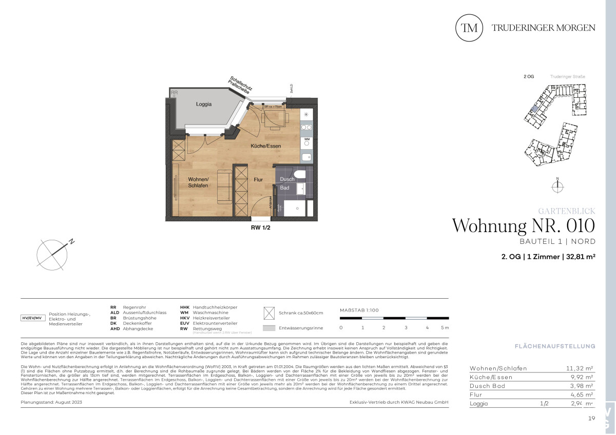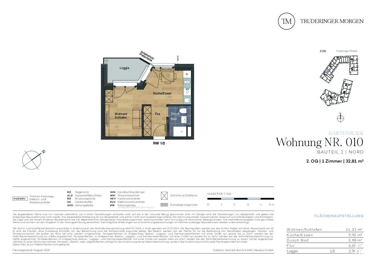 Diese helle 1-Zimmer-Wohnung mit Loggia befindet sich im 2. OG einer neuen, attraktiven Wohnanlage, dem Truderinger Morgen. Der Wohnung bietet auf ca. 32,81 m² Wohnfläche viel Gestaltungsfreiraum. Gerade die 1-Zimmer-Einheiten eignen sich hervorragend als Kapitalanlage. Der Wohn- und Schlafbereich ist optisch vom Koch- und Essbereich separiert und bietet jeweils einen Zugang zur Loggia. Auf der gemütlichen Loggia können Sie Ihre Ruhe-Oase gestalten und eine Auszeit genießen. Großformatige Fliesen in den Bädern, edles Echtholz-Parkett im Wohnbereich, elektrische Rollläden, Fußbodenheizung und Tiefgaragenstellplätze mit optionaler E-Ladestation sind nur einige der Vorzüge für den hochwertigen Wohnraum, den Sie in dieser neuen Eigentumswohnung vorfinden. Ergänzt wird der hohe Wohnkomfort mit einer ausgezeichneten Infrastruktur für Alltag und Freizeit inmitten des modernen, urbanen Flairs des aufstrebenden Stadtteils im Münchener Osten.