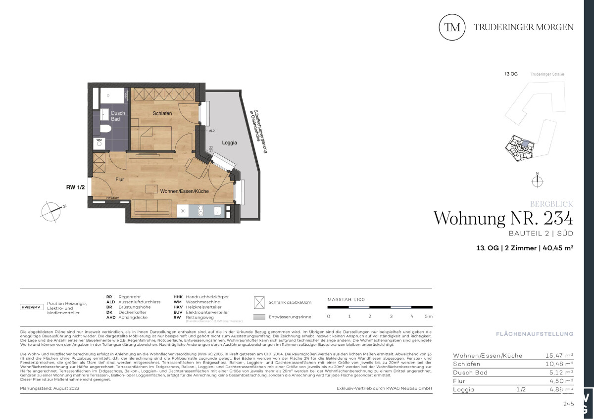 Die 2-Zimmer-Neubauwohnung befindet im 13. OG des Truderinger Morgen, im Bereich Bergblick. In diesem schönen Objekt erwartet Sie ca. 40,45 m² Wohlfühlambiente. Die 2-Zimmer-Wohnung ist auch gut als Kapitalanlage geeignet. Der Flur bietet Platz für Einbauschränke und führt in den offenen Wohn- und Essbereich. Dieser bietet zwei Zugänge zur anschließenden Loggia. Auch das Schlafzimmer verfügt über einen Austritt auf die schöne Loggia, welche sogar bei schlechtem Wetter die Möglichkeit bietet, frische Luft zu genießen. Im Duschbad erwarten Sie eine bodengleiche Dusche, ein Handtuchheizkörper, Markenausstattung sowie großformatige Fliesen. Bei der Materialauswahl des Objekts wurde besonderer Wert auf Nachhaltigkeit gelegt. Die moderne Wohnung begeistert mit elektrischen Rollläden und Fußbodenheizung. Gestalten Sie Ihr neues Heim im prosperierenden Münchener Osten mit perfekter Verkehrsanbindung und optimaler Infrastruktur für Arbeitsalltag und Freizeitgestaltung. Ergänzt wird der hohe Wohnkomfort mit ressourcenschonenden Technologien wie Photovoltaik und Mieterstrommodell.OBJEKT