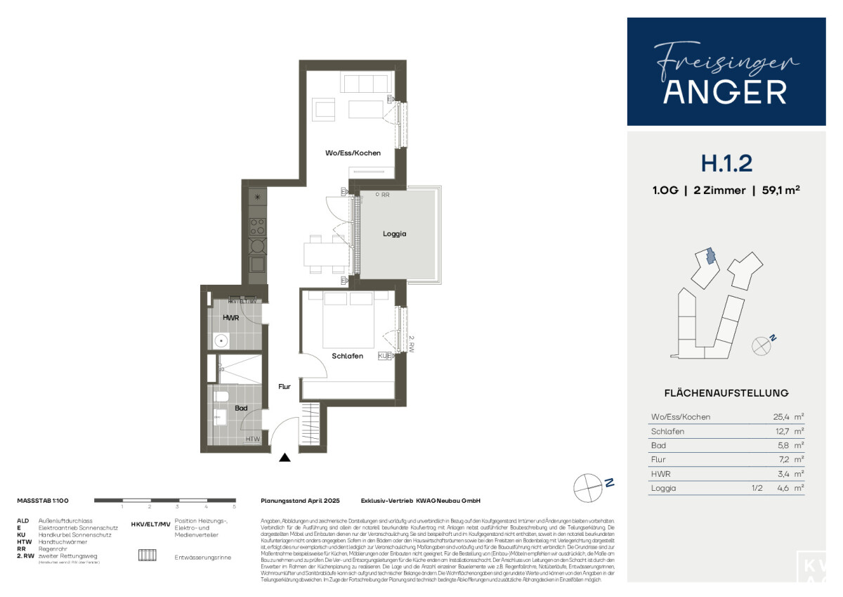 Kompakt, clever geschnitten und perfekt für Singles, Paare oder Kapitalanleger: Diese moderne 2-Zimmer-Wohnung im 1. Obergeschoss überzeugt mit ca. 59,1 m² Wohnfläche, einem offenen Wohnkonzept, einer geschützten Loggia und einem intelligent strukturierten Grundriss, der Funktion und Wohngefühl stilvoll miteinander verbindet.Bereits beim Betreten fällt die klare Raumaufteilung auf: Der Flur führt Sie linkerhand zum Badezimmer, ausgestattet mit Feinsteinzeugfliesen, eleganter Sanitärausstattung und komfortabler Regendusche. Rechterhand befindet sich das gut geschnittene Schlafzimmer - ein ruhiger Rückzugsort mit Platz für Stauraum oder Homeoffice-Ecke.