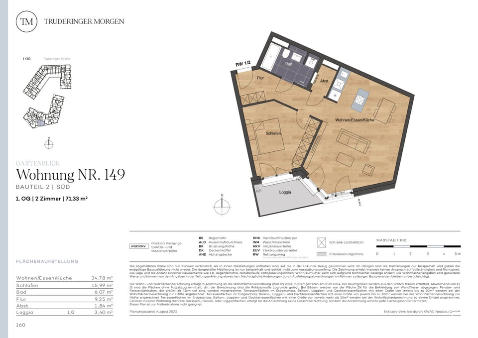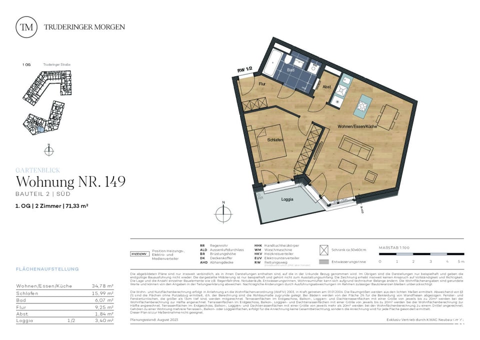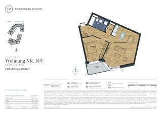 Diese 2-Zimmer-Wohnung mit Süd-Loggia befindet sich im 1. OG der neuen, attraktiven Wohnanlage "Truderinger Morgen". Großzügig geschnitten, bietet sie mit ca. 71,33m² Wohnfläche viel Gestaltungsfreiraum. Vom Flur aus gelangen Sie in das Wannenbad, das Schlafzimmer mit Zugang zur Loggia sowie den praktischen Abstellraum. Der offene Wohn-, Ess- und Kochbereich bietet ebenfalls Zugang zur Loggia. Auf der Süd-Loggia können Sie Ihre Ruhe-Oase gestalten und den Feierabendmit herrlichem Gartenblick genießen. Großformatige Fliesen im Badezimmer, Echtholz-Parkett in den Wohnräumen, elektrische Rollläden, Fußbodenheizung und Tiefgaragenstellplätze mit optionaler E-Ladestation sind nur einige der Vorzüge für den hochwertigen Wohnraum, den Sie in dieser neuen Eigentumswohnung vorfinden. Die Infrastruktur ist ausgezeichnet für den Alltag und Freizeit und Sie leben inmitten des modernen, urbanen Flairs des aufstrebenden Stadtteils im Münchener Osten.