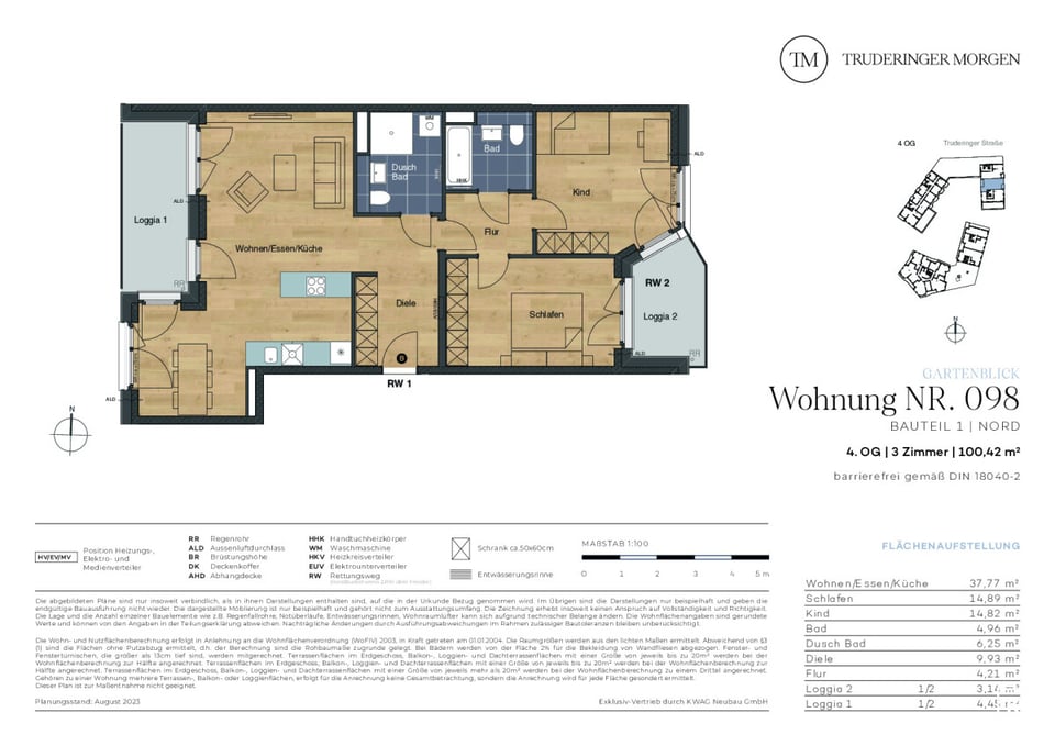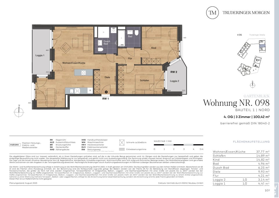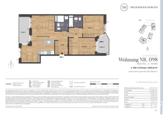 Das Neubauprojekt Truderinger Morgen steht für modernen Komfort und nachhaltiges Wohnen. Die barrierefreie 3-Zimmer-Wohnung mit zwei Loggien im 4. OG erstreckt sich auf ca. 100,42 m². Mit elegantem Echtholzparkett in den Wohnbereichen sowie großformatigen Fliesen zur Fußbodenheizung werden Wohnträume wahr. Vom Eingang aus betreten Sie die großzügige und einladende Diele mit angrenzendem Duschbad. Linker Hand befindet sich der Wohn-, Ess- und Kochbereich mit Zugang zur ersten Loggia. Rechter Hand des Eingangs befinden sich die privaten Räume wie Kinderzimmer, Badezimmer, Schlafzimmer sowie die zweite Loggia. Diese sind durch eine Tür von der Diele abgetrennt. Ergänzt wird der hohe Wohnkomfort mit einer ausgezeichneten Infrastruktur für Alltag und Freizeit inmitten des modernen, urbanen Flairs des aufstrebenden Stadtteils im Münchener Osten.