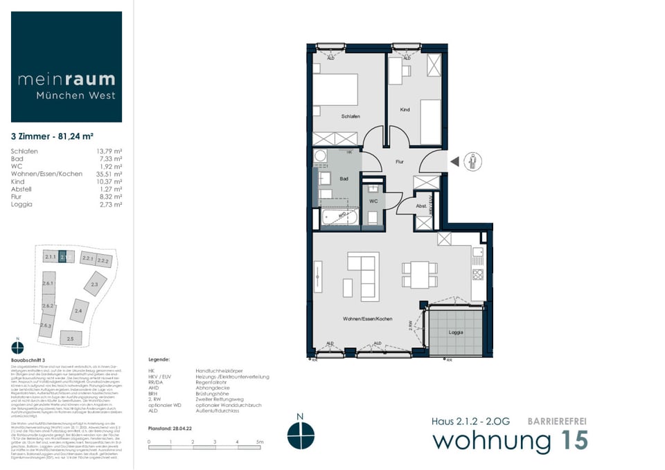 Suchen Sie ein Heim mit modernem Ambiente oder ein kleines Wohlfühlparadies mit lichtdurchfluteten Zimmern? Die stilvollen Eigentumswohnungen im Stadtquartier meinraum München West warten geradezu darauf, dass ihnen anspruchsvolle Bewohner Leben einhauchen. Diese 3-Zimmer-Wohnung mit großem Wohnbereich und integrierter Loggia befindet sich im 2. OG einer neuen, attraktiven Wohnanlage. In diesem schönen Objekt erwartet Sie 81,24m² modernster Wohnkomfort. Mit eleganten Landhaus-Dielen in sämtlichen Wohnbereichen und großformatigen Feinsteinzeug-Fliesen zur Fußbodenheizung werden Wohnträume wahr. Genießen Sie auf der Loggia sonnige Stunden im Freien.