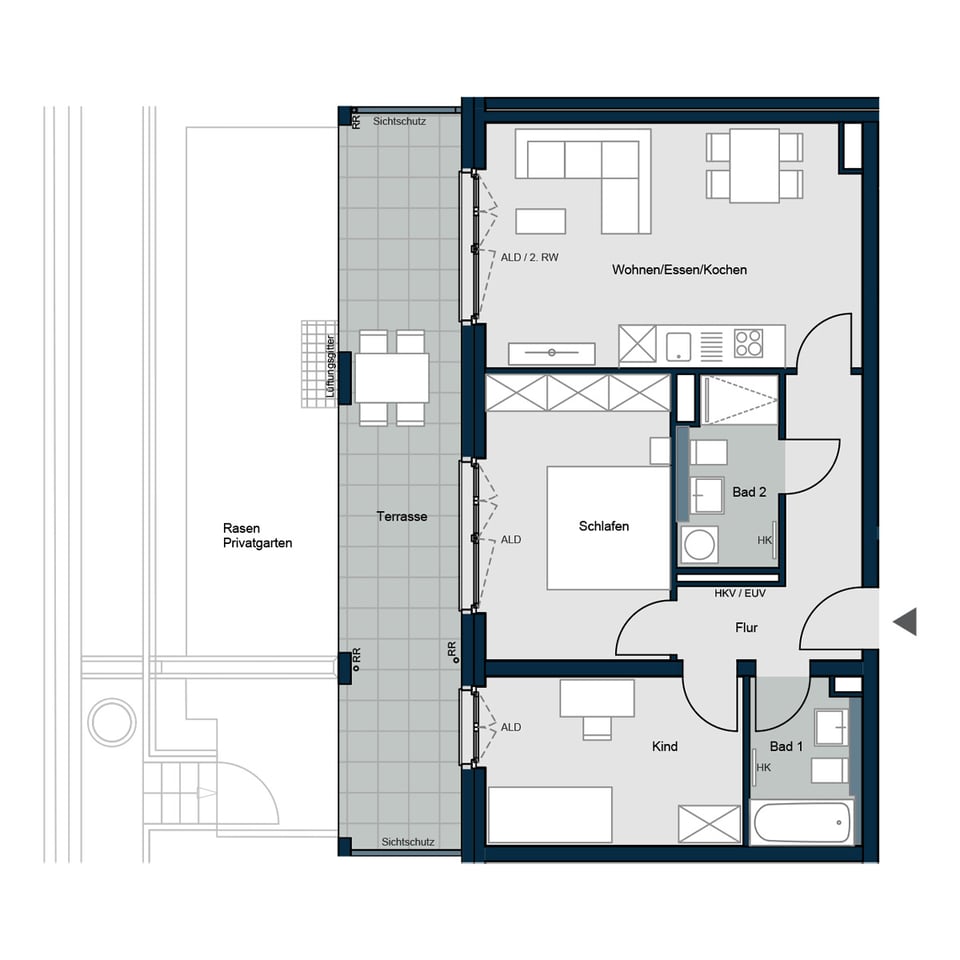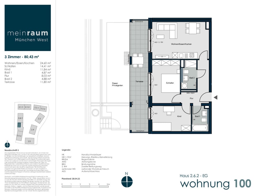 Suchen Sie ein Heim mit modernem Ambiente oder ein kleines Wohlfühlparadies mit lichtdurchfluteten Zimmern? Die stilvollen Eigentumswohnungen im Stadtquartier meinraum München West warten geradezu darauf, dass ihnen anspruchsvolle Bewohner Leben einhauchen. Die 3-Zimmer-Wohnung mit Terrasse und Garten im Erdgeschoss einer stilvollen Wohnanlage wird Sie begeistern. In diesem schönen Objekt erwartet Sie 80,43m² modernster Wohnkomfort. Mit eleganten Landhaus-Dielen in sämtlichen Wohnbereichen und großformatigen Feinsteinzeug-Fliesen zur Fußbodenheizung werden Wohnträume wahr. Im Aussenbereich lädt die schöne Terrasse zum Verweilen ein.