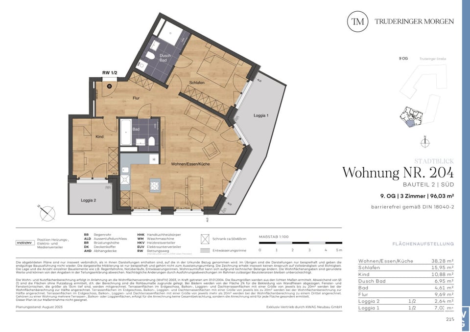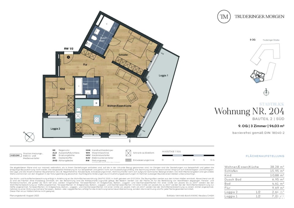 Das Neubauprojekt Truderinger Morgen steht für modernen Komfort und nachhaltiges Wohnen. Die barrierefreie 3-Zimmer-Wohnung mit zwei Loggien im 9. OG erstreckt sich auf ca. 96,03 m². Die Wohnung bietet aufgrund der niedrigen Umgebungsbebauung einen einmaligen Blick über die Stadt München. Mit elegantem Echtholzparkett in den Wohnbereichen sowie großformatigen Fliesen in den Bädern werden Wohnträume wahr. Vom Eingang aus betreten Sie den großzügigen und einladenden Flur mit Platz für Einbauschränke oder eine Garderobe. Ebenfalls erreichen Sie hier das Kinderzimmer mit Zugang zur kleinen Loggia sowie das Wannenbad. Der großzügige Wohn-, Ess- und Kochbereich ist offen und hell gestaltet und verfügt über zwei Zugänge zur Süd-Loggia. Das Schlafzimmer überzeugt durch ein Duschbad en Suite. Die gesamte Wohnung ist dabei barrierefrei. Die Materialauswahl ist hochwertig und schadstoffarm. Ergänzt wird der hohe Wohnkomfort mit einer ausgezeichneten Infrastruktur für Alltag und Freizeit inmitten des modernen, urbanen Flairs des aufstrebenden Stadtteils im Münchener Osten.