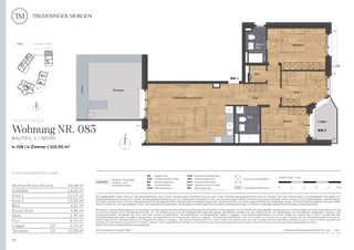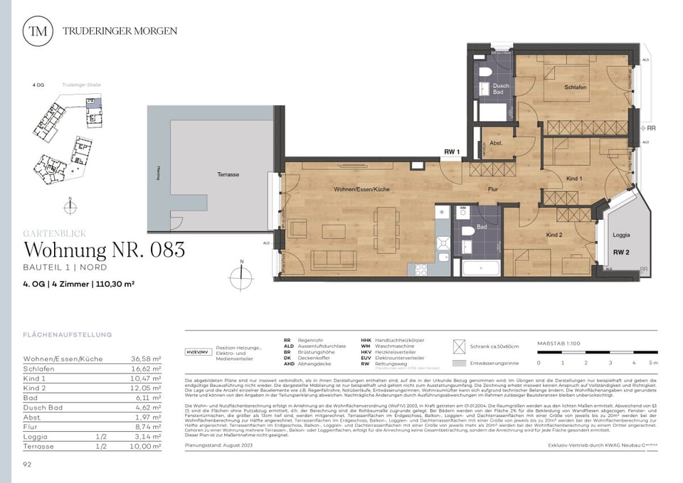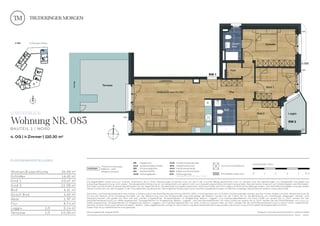 Das Neubauprojekt Truderinger Morgen steht für modernen Komfort und nachhaltiges Wohnen. Diese wunderschöne 4-Zimmer-Wohnung mit einer großen Dachterrasse sowie einer Loggia im 4. OG erstreckt sich auf ca. 110,30 m². Mit elegantem Echtholzparkett in den Wohnbereichen sowie großformatigen Fliesen zur Fußbodenheizung werden Wohnträume wahr. Vom Flur aus gelangen Sie in den großzügigen Wohn-, Ess- und Kochbereich mit angrenzender Dachterrasse. Ein herrlicher Blick in den Garten erwartet Sie hier. Das Badezimmer mit Badewanne, ein Schlafzimmer mit Duschbad en Suite sowie ein Abstellraum sind ebenfalls vorhanden. Die beiden Kinderzimmer haben jeweils einen eigenen Zugang zur Loggia. Ergänzt wird der hohe Wohnkomfort durch Nachhaltigkeit sowie eine ausgezeichnete Infrastruktur für Alltag und Freizeit inmitten des modernen, urbanen Flairs des aufstrebenden Stadtteils im Münchener Osten. In dieser Wohnung kann sich die ganze Familie zuhause fühlen.