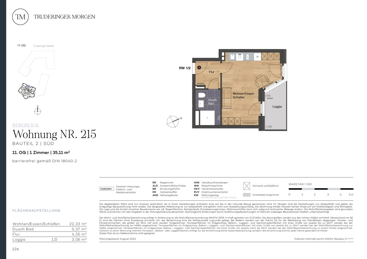 Die barrierefreie 1-Zimmer-Wohnung mit ca. 35,11 m² Wohnfläche und einer schönen Loggia befindet sich im 11. OG des Neubauprojekts Truderinger Morgen, im Bereich Bergblick. Die Räume sind dabei optimal geschnitten und bieten ausreichend Platz zum Wohlfühlen. Diese Immobilie eignet sich auch sehr gut als Kapitalanlage. Die Loggia lädt zu gemütlichen Stunden ein. Das Duschbad erreichen Sie vom abgetrennten Flur aus und es verfügt über eine bodengleiche Dusche, einen Handtuchheizkörper und großformatige Fliesen. Echtholzparkett im Wohnbereich, elektrische Rollläden, Fußbodenheizung und Tiefgaragenstellplätze mit optionaler E-Ladestation sind nur einige der Vorzüge des hochwertigen Wohnraums. Ein Aufzug bringt Sie bequem von der Tiefgarage bis zur elften Etage. Ergänzt wird der hohe Wohnkomfort mit einer optimalen Anbindung und einer ausgezeichneten Infrastruktur für Alltag und Freizeit inmitten des modernen, urbanen Flairs des aufstrebenden Stadtteils im Münchner Osten.OBJEKT