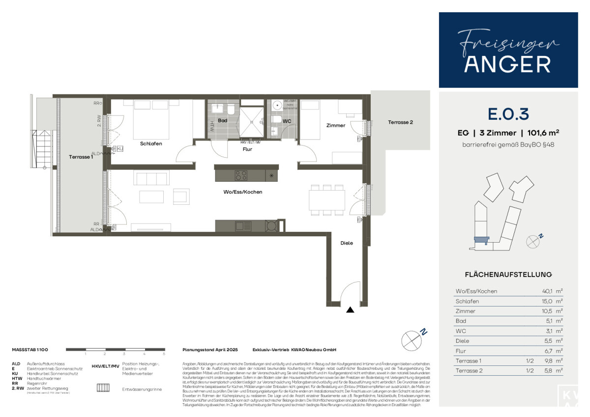 Willkommen in Wohnung E.0.3 im Freisinger Anger - eine barrierefreie 3-Zimmer-Neubauwohnung im Erdgeschoss mit ca. 101,6 m² Wohnfläche, ideal für alle, die großzügiges, komfortables und zukunftssicheres Wohnen mit grüner Umgebung kombinieren möchten.Die Wohnung überzeugt bereits beim Betreten mit einer freundlichen Diele, die in den offenen Essbereich übergeht. Von dort führt ein elegant gestalteter, durchgängig begehbarer Kochbereich mit moderner Wandzeile in den großzügigen Wohnbereich - gemeinsam bilden diese drei Zonen eine lichtdurchflutete Wohnlandschaft mit ca. 40,1 m². Eine bodentiefe Fensterfront öffnet den Wohnraum zur ersten Terrasse, die sowohl vom Wohnzimmer als auch vom Schlafzimmer zugänglich ist - ideal für sonnige Stunden oder ruhige Rückzugsorte.