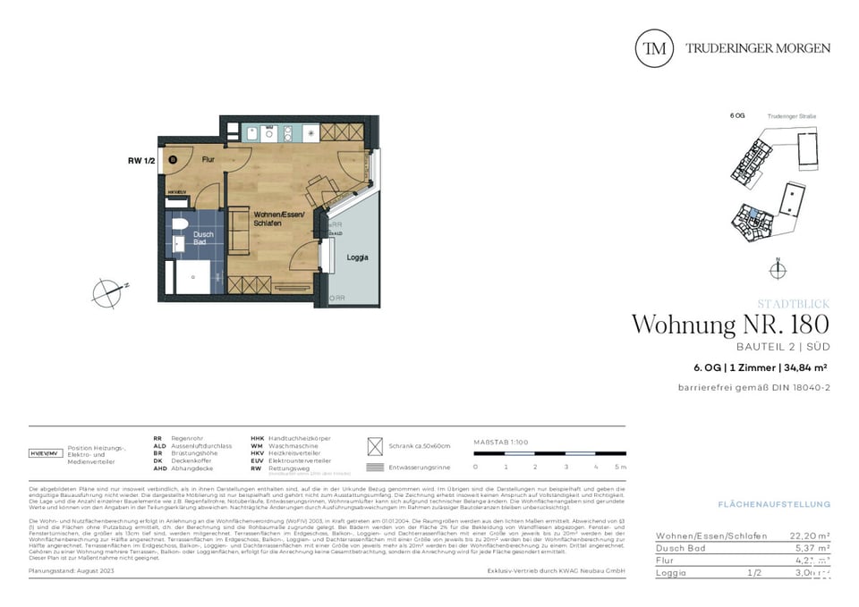Die barrierefreie 1-Zimmer-Wohnung mit ca. 34,84 m² Wohnfläche und einer schönen Loggia befindet sich im 6. OG des Neubauprojekts Truderinger Morgen. Die Räume sind dabei optimal geschnitten und bieten ausreichend Platz zum Wohlfühlen. Diese Immobilie eignet sich auch sehr gut als Kapitalanlage. Die Loggia lädt zu gemütlichen Stunden ein. Das Duschbad erreichen Sie vom abgetrennten Flur aus und es verfügt über eine bodengleiche Dusche, einen Handtuchheizkörper und großformatige Fliesen. Echtholzparkett im Wohnbereich, elektrische Rollläden, Fußbodenheizung und Tiefgaragenstellplätze mit optionaler E-Ladestation sind nur einige der Vorzüge des hochwertigen Wohnraums. Ergänzt wird der hohe Wohnkomfort mit einer optimalen Anbindung und einer ausgezeichneten Infrastruktur für Alltag und Freizeit inmitten des modernen, urbanen Flairs des aufstrebenden Stadtteils im Münchner Osten.OBJEKT
