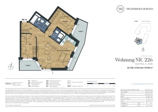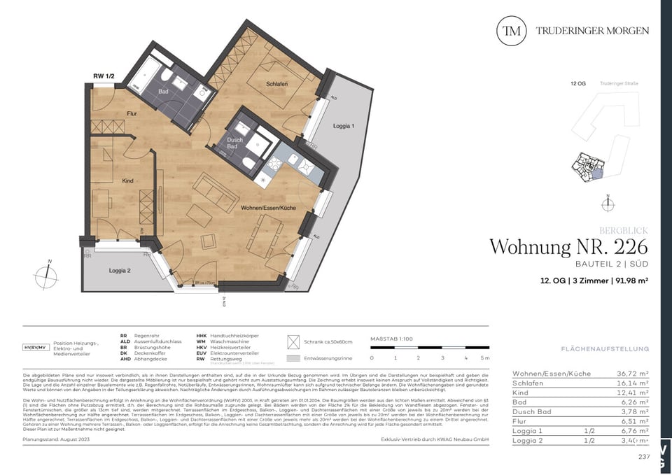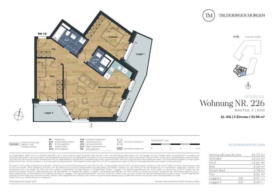 Diese helle 3-Zimmer-Wohnung mit zwei Loggien befindet sich im 12. OG der neuen, attraktiven Wohnanlage "Truderinger Morgen". Großzügig geschnitten, bietet sie mit ca. 91,98 m² Wohnfläche viel Platz zum Wohnen und Leben. Vom Flur aus gelangen Sie in das Wannenbad, das Kinderzimmer mit Zugang zur Süd-Loggia sowie in den großen Wohn,- Ess- und Küchenbereich. Der offene Wohn-, Ess- und Kochbereich bietet Zugang zu beiden Loggien und wirkt durch die Fensterfronten besonders hell und freundlich. Das Schlafzimmer grenzt an die Ost-Loggia an. Ein weiteres Duschbad ist ebenfalls Teil der Wohnung. Auf den Loggien können Sie Ihre Ruhe-Oasen gestalten und den Feierabend sowie den einmaligen Blick bis hin zu den imposanten Alpen genießen. Großformatige Fliesen in den Bädern, Echtholz-Parkett in den Wohnräumen, elektrische Rollläden, Fußbodenheizung und Tiefgaragenstellplätze mit optionaler E-Ladestation sind nur einige der Vorzüge für den hochwertigen Wohnraum dieser neuen Eigentumswohnung. Die Infrastruktur ist ausgezeichnet für Alltag und Freizeit und Sie leben inmitten des modernen, urbanen Flairs des aufstrebenden Stadtteils im Münchener Osten.