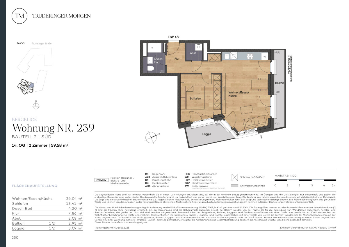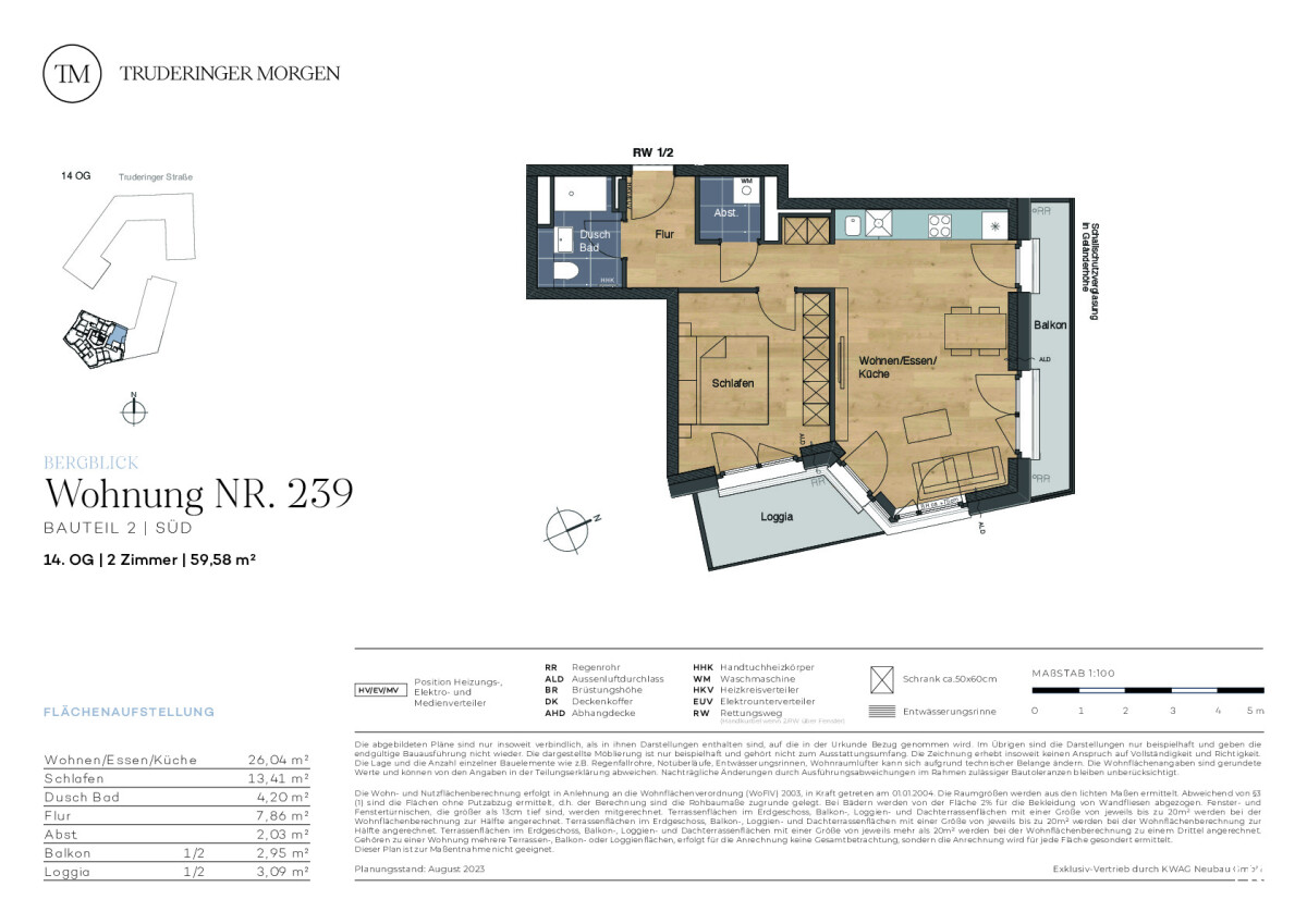 Die Wohnung im obersten, dem 14. Geschoss der neuen, stilvollen Wohnanlage Truderinger Morgen wird Sie, besonders durch die Sichtachsen, begeistern. In dieser Wohneinheit erwartet Sie ca. 59,58 m² modernes und nachhaltiges Wohnen. Vom Flur aus gelangen Sie rechter Hand in das Duschbad. Linker Hand gelangen Sie - am Abstellraum mit Waschmaschinenanschluss sowie dem Schlafzimmer vorbei - in den offenen Wohn-, Ess- und Küchenbereich. Die Loggia erreichen Sie über drei Zugänge vom Wohn- und Schlafzimmer aus. Genießen Sie hier gemütliche Stunden auch bei schlechtem Wetter. Einen weiteren Balkon erreichen Sie ebenfalls vom Wohnbereich aus. Von hier haben Sie, aufgrund der niedrigen Umgebungsbebauung, sogar einen Blick bis hin zu den imposanten Alpen. Die moderne Wohnung begeistert mit elektrischen Rollläden und Fußbodenheizung. Gestalten Sie Ihr neues Heim im prosperierenden Münchener Osten mit perfekter Verkehrsanbindung und optimaler Infrastruktur für Arbeitsalltag und Freizeitgestaltung. Ergänzt wird der hohe Wohnkomfort mit ressourcenschonenden Technologien wie Photovoltaik und Mieterstrommodell sowie Fahrrad-Reparaturräumen und Lastenfahrrad-Sharingstationen.OBJEKT