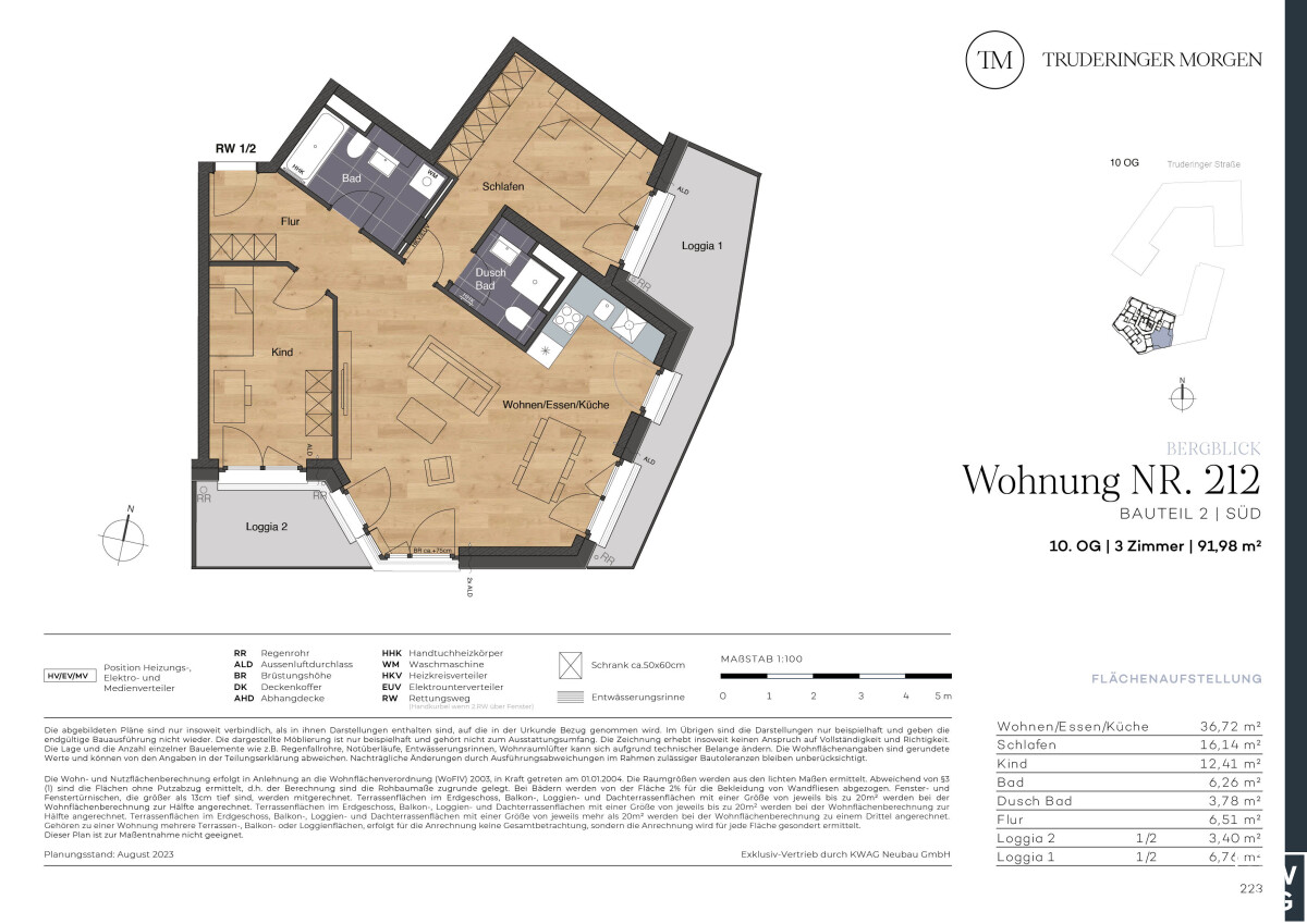 Diese helle 3-Zimmer-Wohnung mit zwei Loggien befindet sich im 10. OG der neuen, attraktiven Wohnanlage "Truderinger Morgen". Großzügig geschnitten, bietet sie mit ca. 91,98 m² Wohnfläche viel Gestaltungsfreiraum. Vom Flur aus gelangen Sie in das Wannenbad, das Kinderzimmer mit Zugang zur Süd-Loggia sowie zum großen Wohn,- Ess- und Küchenbereich. Der offene Wohn-, Ess- und Kochbereich bietet Zugänge zu beiden Loggien und wirkt durch die Fensterfronten besonders hell und freundlich. Das Schlafzimmer grenzt an die Ost-Loggia an. Ein weiteres Duschbad ist ebenfalls Teil der Wohnung. Auf den Loggien können Sie Ihre Ruhe-Oasen gestalten und den Feierabend sowie den einmaligen Blick bis hin zu den imposanten Alpen genießen. Großformatige Fliesen in den Bädern, Echtholz-Parkett in den Wohnräumen, elektrische Jalousien, Fußbodenheizung und Tiefgaragenstellplätze mit optionaler E-Ladestation sind nur einige der Vorzüge für den hochwertigen Wohnraum dieser neuen Eigentumswohnung. Die Infrastruktur ist ausgezeichnet für Alltag und Freizeit und Sie leben inmitten des modernen, urbanen Flairs des aufstrebenden Stadtteils im Münchener Osten.