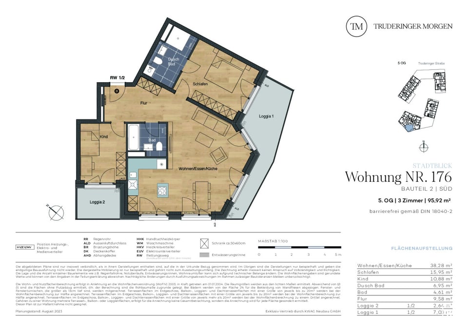 Das Neubauprojekt Truderinger Morgen steht für modernen Komfort und nachhaltiges Wohnen. Die barrierefreie 3-Zimmer-Wohnung mit zwei Loggien im fünften Obergeschoss erstreckt sich auf ca. 95,92 m². Die Wohnung bietet aufgrund der niedrigen Umgebungsbebauung einen einmaligen Blick über die Stadt München. Mit elegantem Echtholzparkett in den Wohnbereichen sowie großformatigen Fliesen in den Bädern werden stilvolle Wohnträume wahr. Vom Eingang aus betreten Sie den großzügigen und einladenden Flur mit Platz für Einbauschränke oder eine Garderobe. Ebenfalls erreichen Sie hier das Kinderzimmer mit Zugang zur kleinen Loggia sowie das Wannenbad. Der großzügige Wohn-, Ess- und Kochbereich ist offen und hell gestaltet und verfügt über zwei Zugänge zur Süd-Loggia. Das Schlafzimmer überzeugt durch ein Duschbad en Suite. Die gesamte Wohnung ist dabei barrierefrei. Die Materialauswahl ist hochwertig und schadstoffarm. Ergänzt wird der hohe Wohnkomfort mit einer ausgezeichneten Infrastruktur für Alltag und Freizeit inmitten des modernen, urbanen Flairs des aufstrebenden Stadtteils im Münchener Osten.