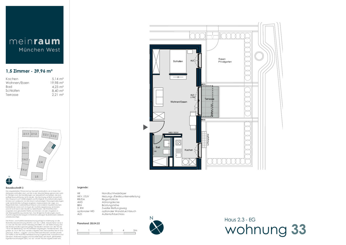 Diese charmante 1,5-Zimmer-Wohnung mit Terrasse im EG befindet sich im Erdgeschoss einer neuen, attraktiven Wohnanlage. Intelligent geschnitten, bietet sie auch mit 39,96m² Wohnfläche viel Gestaltungsfreiraum. Im Aussenbereich lädt die schöne Terrasse zum Verweilen ein. Großformatige Feinsteinzeug-Fliesen in den Bädern, edle Landhaus-Dielen in Eiche in sämtlichen Wohnräumen, elektrische Rollläden, Fußbodenheizung, barrierefreie Zugänge und Tiefgaragenstellplätze mit optionaler E-Ladestation sind nur einige der Vorzüge für den hochwertigen Wohnraum, den Sie in dieser neuen Eigentumswohnung vorfinden. Ergänzt wird der hohe Wohnkomfort mit einer ausgezeichneten Infrastruktur für Alltag und Freizeit inmitten des modernen, urbanen Flairs des aufstrebenden Stadtteils im Münchener Westen.OBJEKT