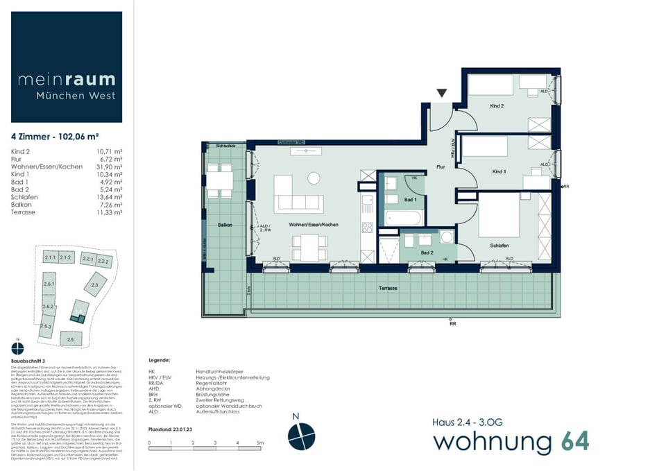 Sie suchen eine Eigentumswohnung im aufstrebenden Stadtteil des Münchner Westen? Möchten Sie ein urbanes Zuhause finden, von dem aus Sie dennoch kurze Wege zu den umliegenden Naherholungsgebieten haben? Dann haben wir das passene Zuhause für Sie. Die charmante 4-Zimmer-Wohnung mit Balkon und DachTerrasse im 3. OG einer stilvollen Wohnanlage wird Sie begeistern. In diesem schönen Objekt erwartet Sie 102,06m² modernster Wohnkomfort. Ausgestattet mit einem Tiefgaragenstellplatz inkl. E-Ladestation, grossformatigen Feinsteinzeug-Fliesen und Markenarmaturen, bietet diese Egeintumswohnung hochwertiger Wohnkomfort. Auf der DachTerrasse kommen Sie in den Genuss von einem großzügigen Outdoor-Bereich. Auf dem gemütlichen Balkon können Sie weine weitere Ruhe-Oase gestalten.