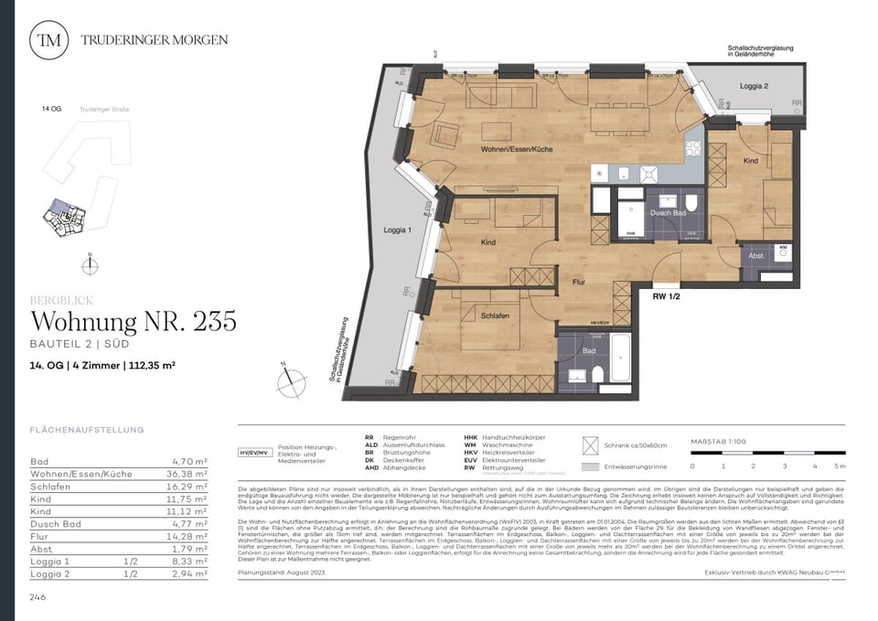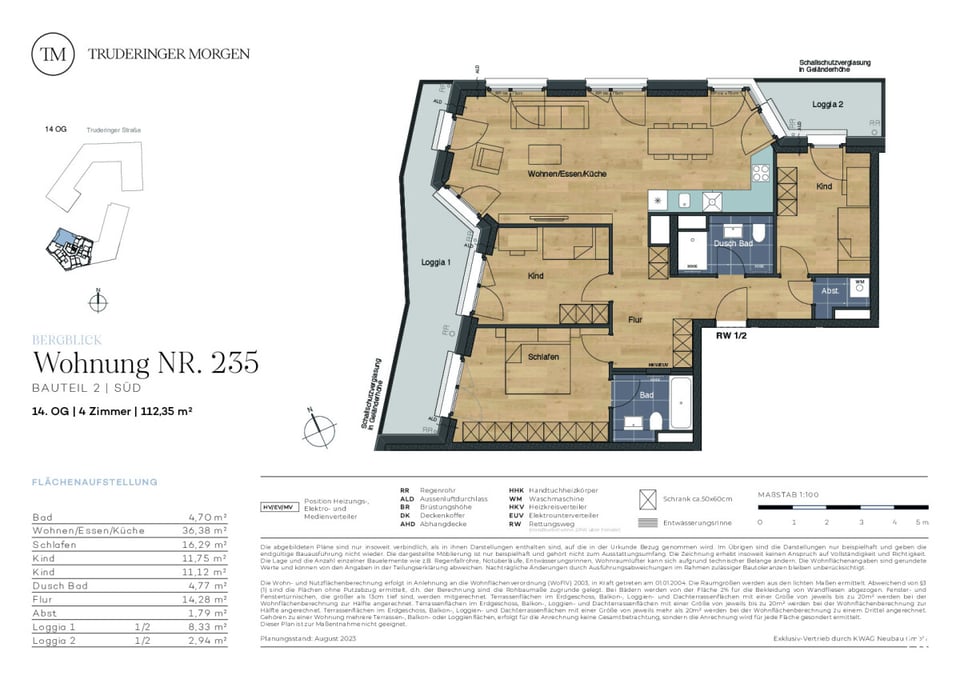 Das Neubauprojekt Truderinger Morgen steht für modernen Komfort und nachhaltiges Wohnen. Diese geschmackvolle 4-Zimmer-Wohnung mit zwei Loggien im 14. Obergeschoss des Turms erstreckt sich auf ca. 112,35 m². Mit elegantem Echtholzparkett in den Wohnbereichen sowie großformatigen Fliesen zur Fußbodenheizung werden Wohnträume wahr. Vom geräumigen Flur aus gelangen Sie - vorbei an Abstellraum, Schlafzimmer, zwei Kinderzimmern, Duschbad und Wannenbad - ins Wohn- und Esszimmer mit offener Küche. Die Highlights der Wohnung sind die große West-Loggia sowie die zweite Loggia, die Sie vom Kinderzimmer und von der Küche aus betreten können. Die große Loggia erstreckt sich über das Schlafzimmer, das zweite Kinderzimmer und den Wohnbereich. Hier können Sie gemütliche Stunden mit einem atemberaubenden Blick bis hin zu den Alpen genießen. Ergänzt wird der hohe Wohnkomfort durch Nachhaltigkeit, schadstoffarme Materialien sowie eine ausgezeichnete Infrastruktur für Alltag und Freizeit inmitten des modernen, urbanen Flairs des aufstrebenden Stadtteils im Münchener Osten.OBJEKT