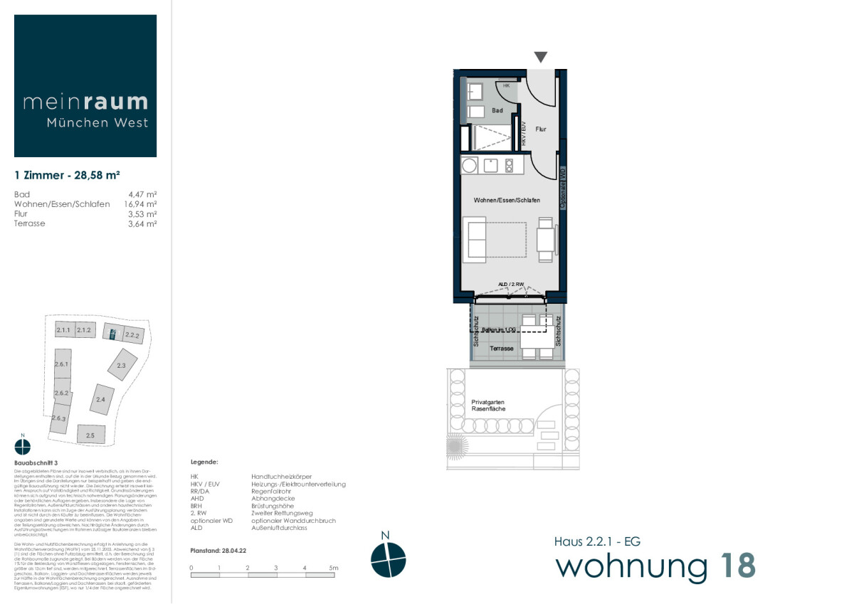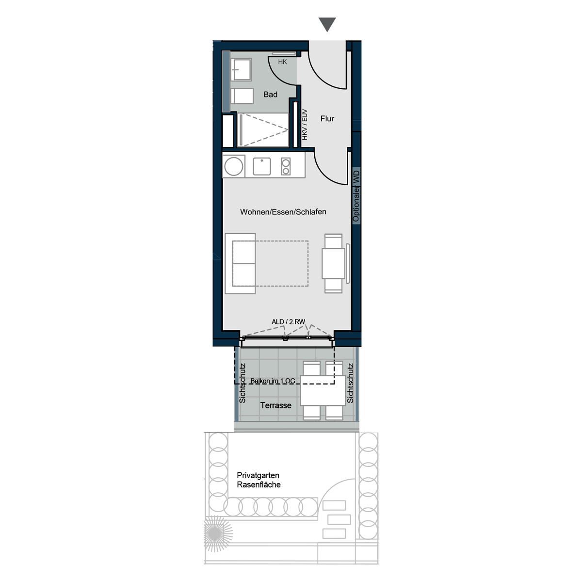 Die entzückende 1-Zimmer-Wohnung mit eigener Terrasse im Erdgeschoss einer stilvollen Wohnanlage wird Sie begeistern. Intelligent geschnitten, bietet sie auch mit 28,58m² Wohnfläche viel Gestaltungsfreiraum. Im Aussenbereich lädt die schöne Terrasse zum Verweilen ein. Großformatige Feinsteinzeug-Fliesen in den Bädern, edle Landhaus-Dielen in Eiche in sämtlichen Wohnräumen, elektrische Rollläden, Fußbodenheizung, barrierefreie Zugänge und Tiefgaragenstellplätze mit optionaler E-Ladestation sind nur einige der Vorzüge für den hochwertigen Wohnraum, den Sie in dieser neuen Eigentumswohnung vorfinden. Ergänzt wird der hohe Wohnkomfort mit einer ausgezeichneten Infrastruktur für Alltag und Freizeit inmitten des modernen, urbanen Flairs des aufstrebenden Stadtteils im Münchener Westen.