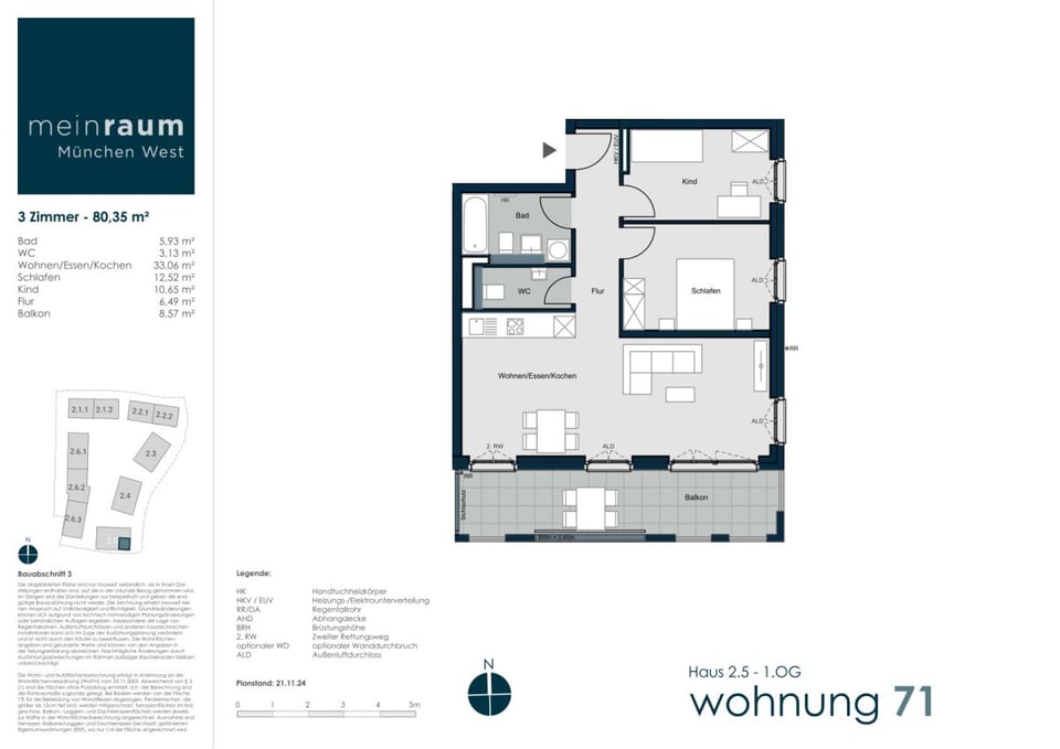 Die Wohnung Nr. 71 ist sofort bezugsfertig und bietet auf ca. 80 m² Wohnfläche einen optimal geschnittenen Grundriss: Ein offener Wohn-/Essbereich mit Küche, ein Schlafzimmer, ein Kinderzimmer, ein Tageslichtbad, ein separates Gäste-WC, sowie ein großzügiger Balkon bieten Komfort und Funktionalität. Perfekt für Paare, kleine Familien oder Berufstätige mit Homeoffice-Bedarf.