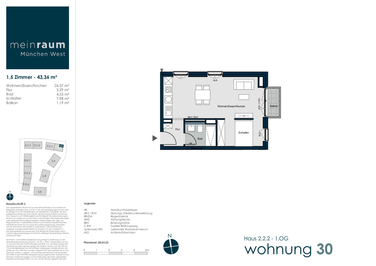 Suchen Sie ein Heim mit modernem Ambiente oder ein kleines Wohlfühlparadies mit lichtdurchfluteten Zimmern? Die stilvollen Eigentumswohnungen im Stadtquartier meinraum München West warten geradezu darauf, dass ihnen anspruchsvolle Bewohner Leben einhauchen. Die große 1,5-Zimmer-Neubauwohnung mit Balkon im 1. OG einer stilvollen Wohnanlage wird Sie begeistern. Intelligent geschnitten, bietet sie auch mit 43,36m² Wohnfläche viel Gestaltungsfreiraum. Mit eleganten Landhaus-Dielen in sämtlichen Wohnbereichen und großformatigen Feinsteinzeug-Fliesen zur Fußbodenheizung werden Wohnträume wahr. Auf dem gemütlichen Balkon können Sie Ihre Ruhe-Oase gestalten und den Feierabend geniessen.