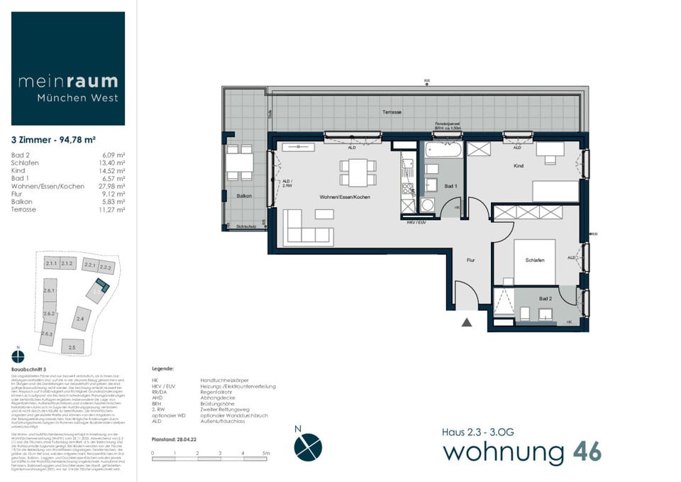Die große 3-Zimmer-Neubauwohnung mit Terrasse und Balkon im 3. OG einer stilvollen Wohnanlage wird Sie begeistern. In diesem schönen Objekt erwartet Sie 94,78m² modernster Wohnkomfort. Ihr neues Zuhause lässt nahezu keine Wünsche offen: Auf der DachTerrasse kommen Sie in den Genuss von einem großzügigen Outdoor-Bereich. Auf dem gemütlichen Balkon können Sie eine weitere Ruhe-Oase gestalten. Die moderne Wohnung begeistet mit elektrischen Rollläden und Fußbodenheizung. Im Winter wird es mit Erfüllung des KfW-55-Standard gemütlich warm. Gestalten Sie Ihr neues Heim im urbanen und zugleich ländlichen Flair des Münchener Westens mit guter Verkehrsanbindung und optimaler Infrastruktur für Arbeitsalltag und Freizeitgestaltung.