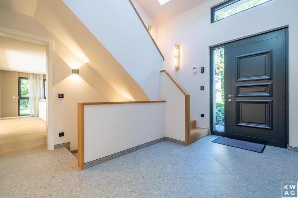 Das im Jahr 1972 in Holzständerbauweise erbaute Bestandsgebäude wurde in den letzten zwei Jahren durch umfangreiche Grundrissanpassungen und diverse Modernisierungsmaßnahmen auf den aktuellen Zustand gebracht. Es bietet auf ca. 330 m² Wohnfläche (sowie ca. 491 m² Nutzfläche) vielfältige Nutzungs- und Gestaltungsmöglichkeiten. Durch den repräsentativen Eingangsbereich gelangt man durch eine Flügeltüre in das Herz der Villa, den großzügigen Wohn- und Essbereich, welcher mit einer eleganten offenen Einbauküche ausgestattet ist, die selbstverständlich über sämtliche hochwertige Einbaugeräte verfügt und auf der massiven Steinplatte ausreichend Arbeitsfläche für begeisterte Köche bietet.