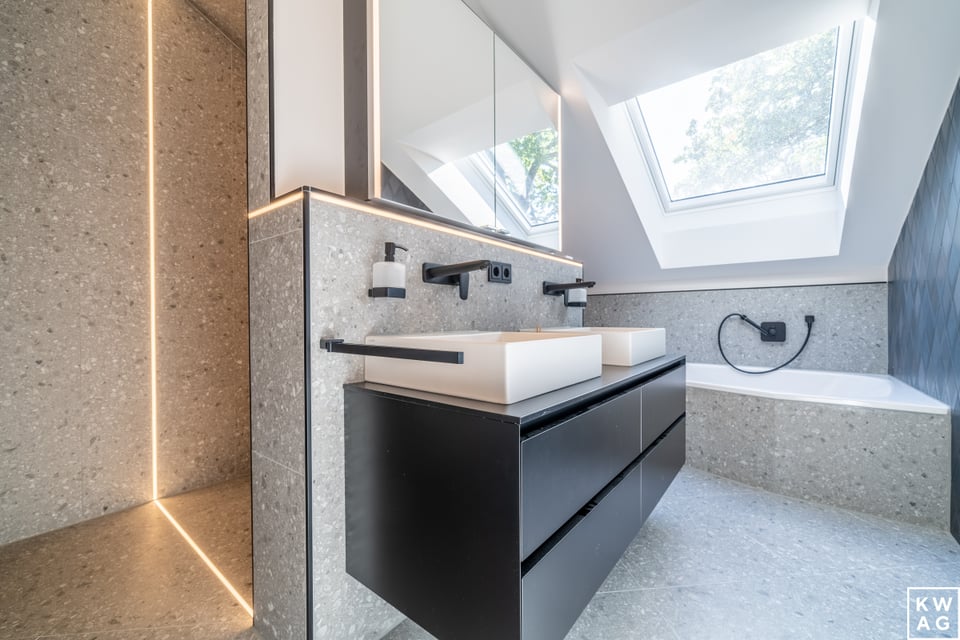 - 4 hochwertig geflieste Bäder mit Armaturen der Firma Vigour in „matt schwarz“, Spiegelschränken, Waschbeckenunterschränken und Design-Handtuchheizkörper der Firma Cordivari (2x im OG je mit Badewanne und Regendusche, 1x EG mit Regendusche, 1x UG mit Regendusche)