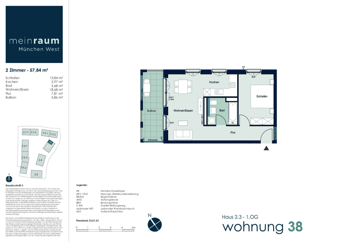 Die gut geschnittene 2-Zimmer-Wohnung mit West-Ausrichtung im 1. OG einer stilvollen Wohnanlage wird Sie begeistern. In diesem schönen Objekt erwartet Sie 57,84m² modernster Wohnkomfort. Auf dem gemütlichen Balkon können Sie Ihre Ruhe-Oase gestalten und den Feierabend geniessen. Großformatige Feinsteinzeug-Fliesen in den Bädern, edle Landhaus-Dielen in Eiche in sämtlichen Wohnräumen, elektrische Rollläden, Fußbodenheizung, barrierefreie Zugänge und Tiefgaragenstellplätze mit optionaler E-Ladestation sind nur einige der Vorzüge für den hochwertigen Wohnraum, den Sie in dieser neuen Eigentumswohnung vorfinden. Ergänzt wird der hohe Wohnkomfort mit einer ausgezeichneten Infrastruktur für Alltag und Freizeit inmitten des modernen, urbanen Flairs des aufstrebenden Stadtteils im Münchener Westen.