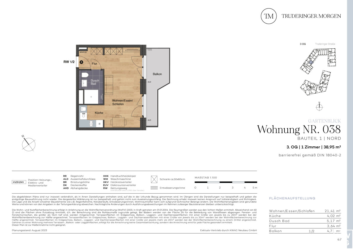 Barrierefrei: Diese 1-Zimmer-Wohnung befindet sich im 3. OG des Neubauprojekts Truderinger Morgen im Osten von München und misst ca. 38,95 m². Ein schöner Flur führt in den großen Wohn-, Ess- und Schlafbereich mit angrenzendem Küchenbereich. Die großen Fensterfronten schaffen Helligkeit, und der Balkon erstreckt sich über die gesamte Länge der Wohnung. Das Badezimmer ist aufgrund der Barrierefreiheit großzügig gestaltet und mit großformatigen Fliesen, hochwertigen Sanitärartikeln und Markenarmaturen ausgestattet. Im Wohnbereich erwarten Sie Echtholzparkett und Fußbodenheizung. Auf dem großen Balkon können Sie oder Ihre Mieter ruhige Stunden genießen.