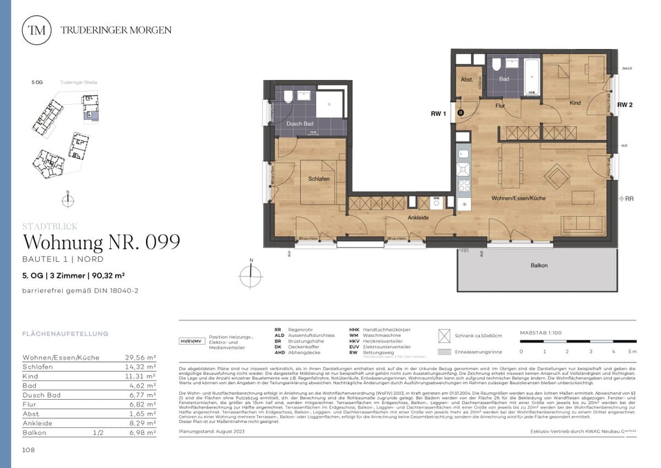 Das Neubauprojekt Truderinger Morgen steht für modernen Komfort und nachhaltiges Wohnen. Die barrierefreie 3-Zimmer-Wohnung mit einer großen Dachterrasse im 5. OG erstreckt sich auf ca. 90,32 m². Mit elegantem Echtholzparkett in den Wohnbereichen sowie großformatigen Fliesen zur Fußbodenheizung ist die Immobilie hochwertig gestaltet. Vom Flur aus gelangen Sie in einen praktischen Abstellraum, ein Badezimmer mit Badewanne sowie das Kinderzimmer. Auch der offen gestaltete Wohn-, Ess- und Kochbereich befindet sich hier und besticht durch seine Helligkeit und seinen Schnitt. Durch die Ankleide, mit Waschmaschinenanschluss, gelangen Sie in das helle Schlafzimmer mit Duschbad en Suite. Den schönen Balkon erreichen Sie über das Wohnzimmer. Ergänzt wird der hohe Wohnkomfort durch Nachhaltigkeit sowie eine ausgezeichnete Infrastruktur für Alltag und Freizeit inmitten des modernen, urbanen Flairs des aufstrebenden Stadtteils im Münchener Osten.