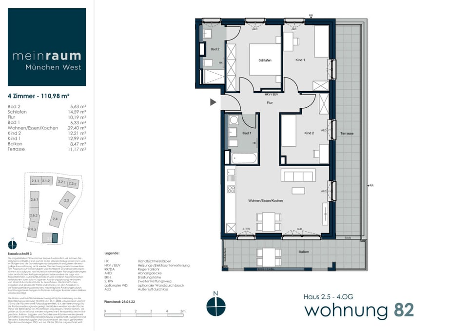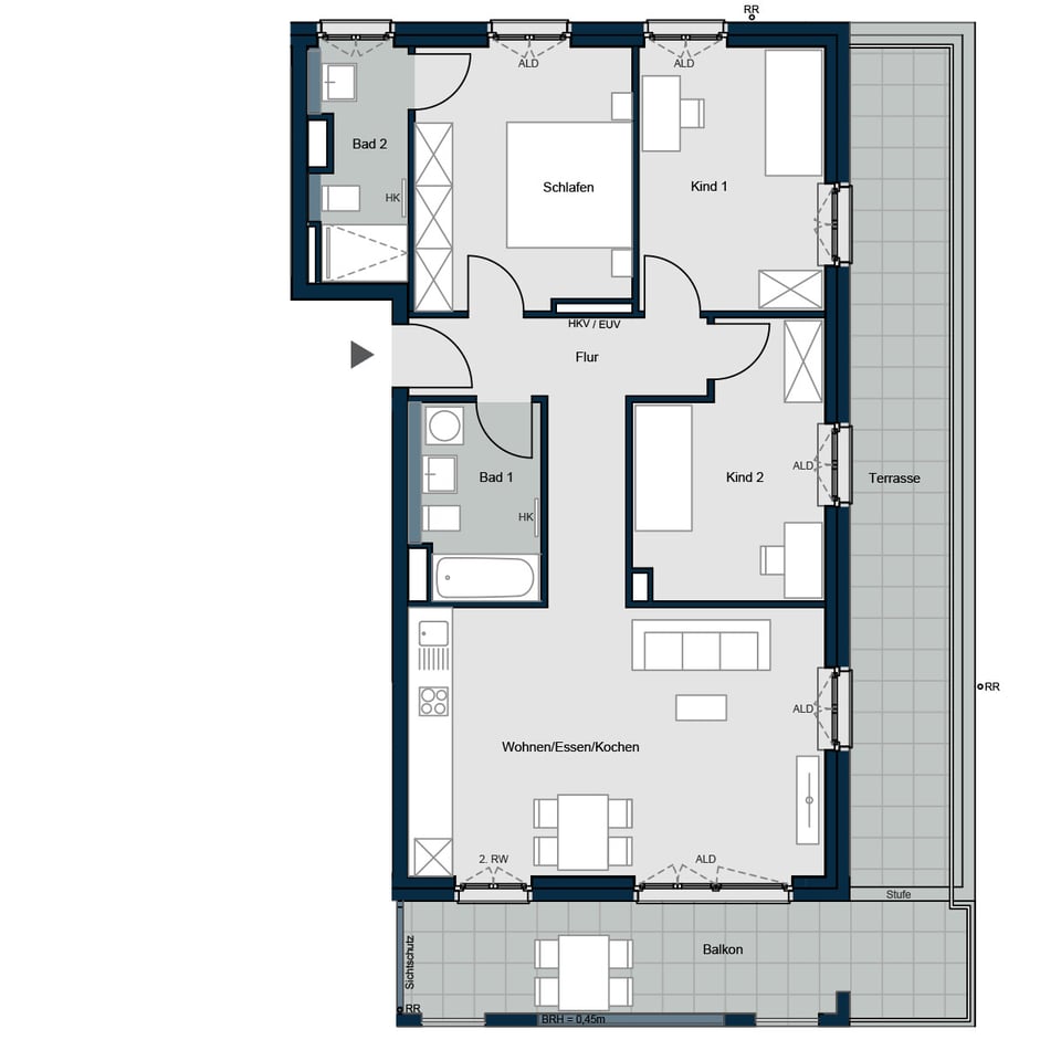 Sie suchen ein stilvolles Zuhause, das urbanes Ambiente mit ländlicher Freiheit verbindet? Die helle und gut geschittene 4-Zimmer-Wohnung mit Dachterrasse im 4. OG einer stilvollen Wohnanlage wird Sie begeistern. In diesem schönen Objekt erwartet Sie 110,98m² modernster Wohnkomfort. Auf dem gemütlichen Balkon können Sie Ihre Ruhe-Oase gestalten und den Feierabend geniessen. Elegante Landhaus-Dielen in Eiche bedecken die Böden in allen Wohnräumen, während großformatige Feinsteinzeug-Fliesen und Markenarmaturen den Stil der Bäder prägen. Fußbodenheizung und elektrische Rollläden sind in allen Wohneinheiten von 30 bis 130 m2 vorhanden. Alle Wohnungen sind zudem durch Aufzüge barrierefrei zugänglich um höchsten Wohnkomfort bis ins hohe Alter zu genießen.