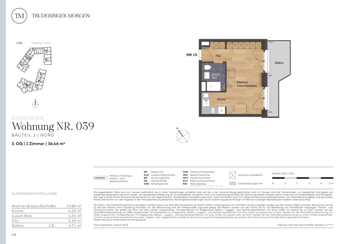 Die 1-Zimmer-Wohnung mit ca. 36,46 m² Wohnfläche und großem Balkon befindet sich im 3. OG des Neubauprojekts Truderinger Morgen. Die Räume sind optimal geschnitten und bieten viel Platz zum Leben und Wohlfühlen. Die Wohnung besticht durch ihre Helligkeit, geschaffen durch die großen Fenster und den großen Balkon. Echtholzparkett im Wohnbereich, große Fliesen im Duschbad, elektrische Rollläden, Fußbodenheizung und Tiefgaragenstellplätze mit optionaler E-Ladestation sind nur einige der Vorzüge für den hochwertigen Wohnraum. Ergänzt wird der hohe Wohnkomfort mit einer optimalen Anbindung und einer ausgezeichneten Infrastruktur für Alltag und Freizeit inmitten des modernen, urbanen Flairs des aufstrebenden Stadtteils im Münchner Osten.