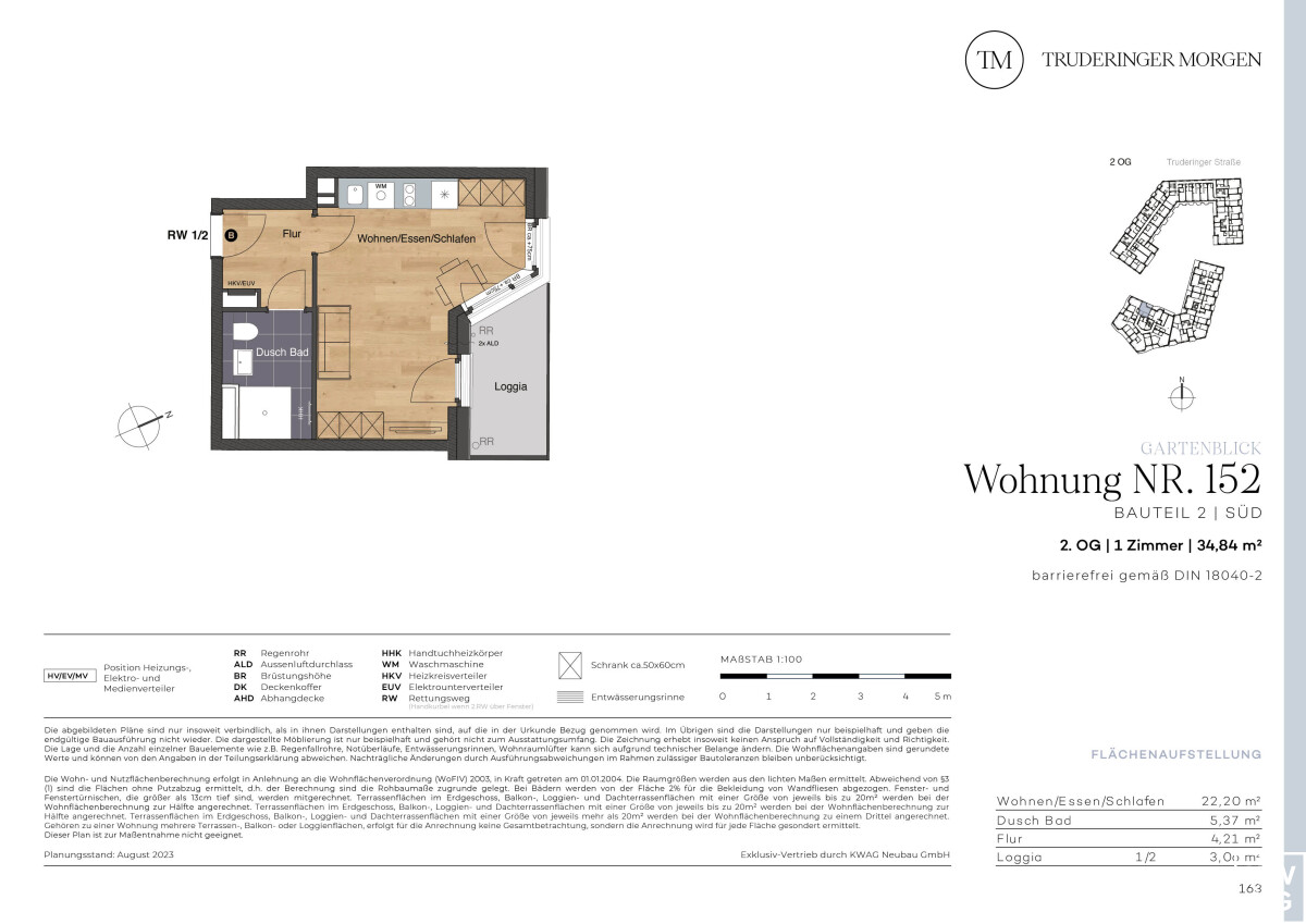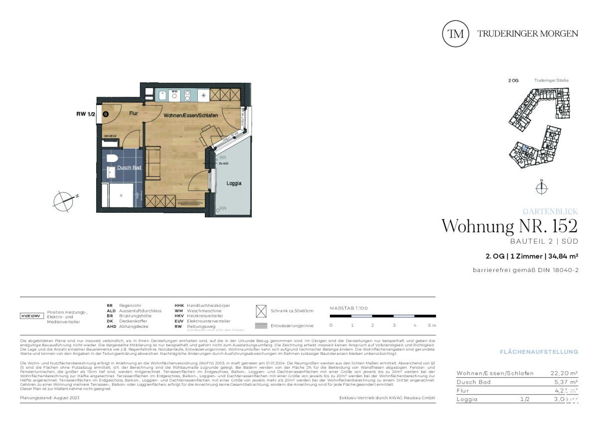 Die 1-Zimmer-Wohnung mit ca. 34,84 m² Wohnfläche und einer schönen Loggia befindet sich im 2.OG des Neubauprojekts Truderinger Morgen. Die Räume sind dabei optimal geschnitten, barrierefrei und bieten viel Platz zum Wohlfühlen. Diese Immobilie eignet sich auch sehr gut als Kapitalanlage. Die Loggia lädt zu gemütlichen Stunden ein und bietet einen beruhigenden Blick ins Grün. Das Duschbad erreichen Sie vom abgetrennten Flur aus und es verfügt über eine bodengleiche Dusche, einen Handtuchheizkörper sowie großformatige Fliesen. Echtholzparkett im Wohnbereich, elektrische Rollläden, Fußbodenheizung und Tiefgaragenstellplätze mit optionaler E-Ladestation sind nur einige der Vorzüge des hochwertigen Wohnraums. Ergänzt wird der hohe Wohnkomfort mit einer optimalen Anbindung und einer ausgezeichneten Infrastruktur für Alltag und Freizeit inmitten des modernen, urbanen Flairs des aufstrebenden Stadtteils im Münchner Osten.