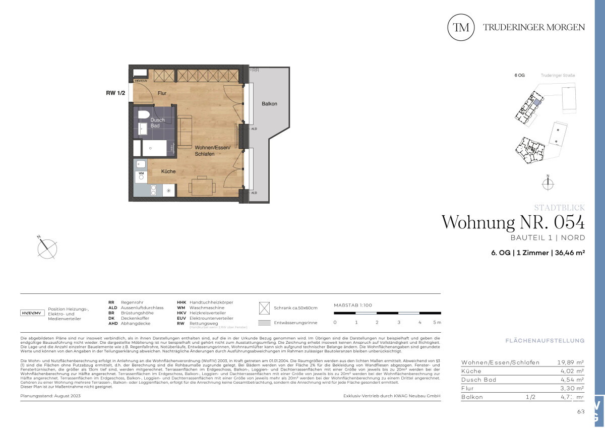 Viel Platz auf ca. 36,46 m²: Diese 1-Zimmer-Wohnung befindet sich im 6. OG des Neubauprojekts Truderinger Morgen im florierenden Münchner Osten. Durch den breiten Flur gelangen Sie in den großen Wohn- und Schlafbereich. Der Küche befindet sich in einer Nische und ist so optisch abgetrennt. Die große Fensterfront mit zwei Ausgängen sorgt für Helligkeit und der Balkon lädt zu gemütlichen Stunden ein. Das Duschbad ist mit einem Handtuchheizkörper, großformatigen Fliesen, hochwertigen Sanitärartikeln und Markenarmaturen ausgestattet. Im Wohnbereich erwarten Sie Echtholzparkett und Fußbodenheizung. Die Immobilie eignet sich auch hervorragend als Kapitalanlage.