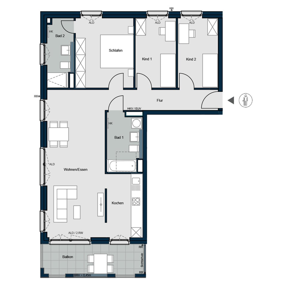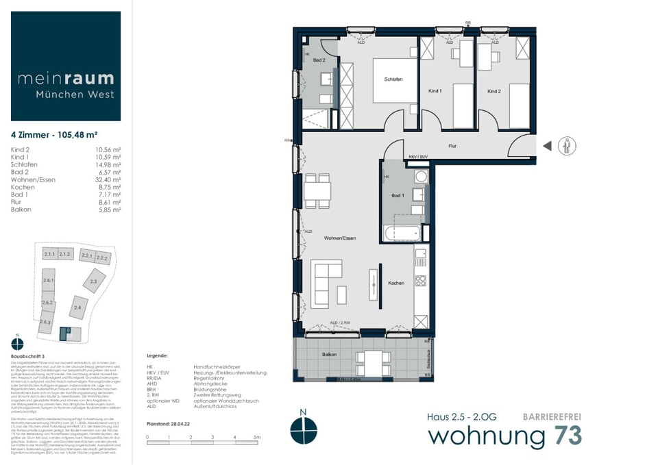 Diese moderne 4-Zimmer-Wohnung mit Süd-West Balkon befindet sich im 2. OG einer neuen, attraktiven Wohnanlage. In diesem schönen Objekt erwartet Sie 105,48m² modernster Wohnkomfort. Auf dem gemütlichen Balkon können Sie Ihre Ruhe-Oase gestalten und den Feierabend geniessen. Großformatige Feinsteinzeug-Fliesen in den Bädern, edle Landhaus-Dielen in Eiche in sämtlichen Wohnräumen, elektrische Rollläden, Fußbodenheizung, barrierefreie Zugänge und Tiefgaragenstellplätze mit optionaler E-Ladestation sind nur einige der Vorzüge für den hochwertigen Wohnraum, den Sie in dieser neuen Eigentumswohnung vorfinden. Ergänzt wird der hohe Wohnkomfort mit einer ausgezeichneten Infrastruktur für Alltag und Freizeit inmitten des modernen, urbanen Flairs des aufstrebenden Stadtteils im Münchener Westen.