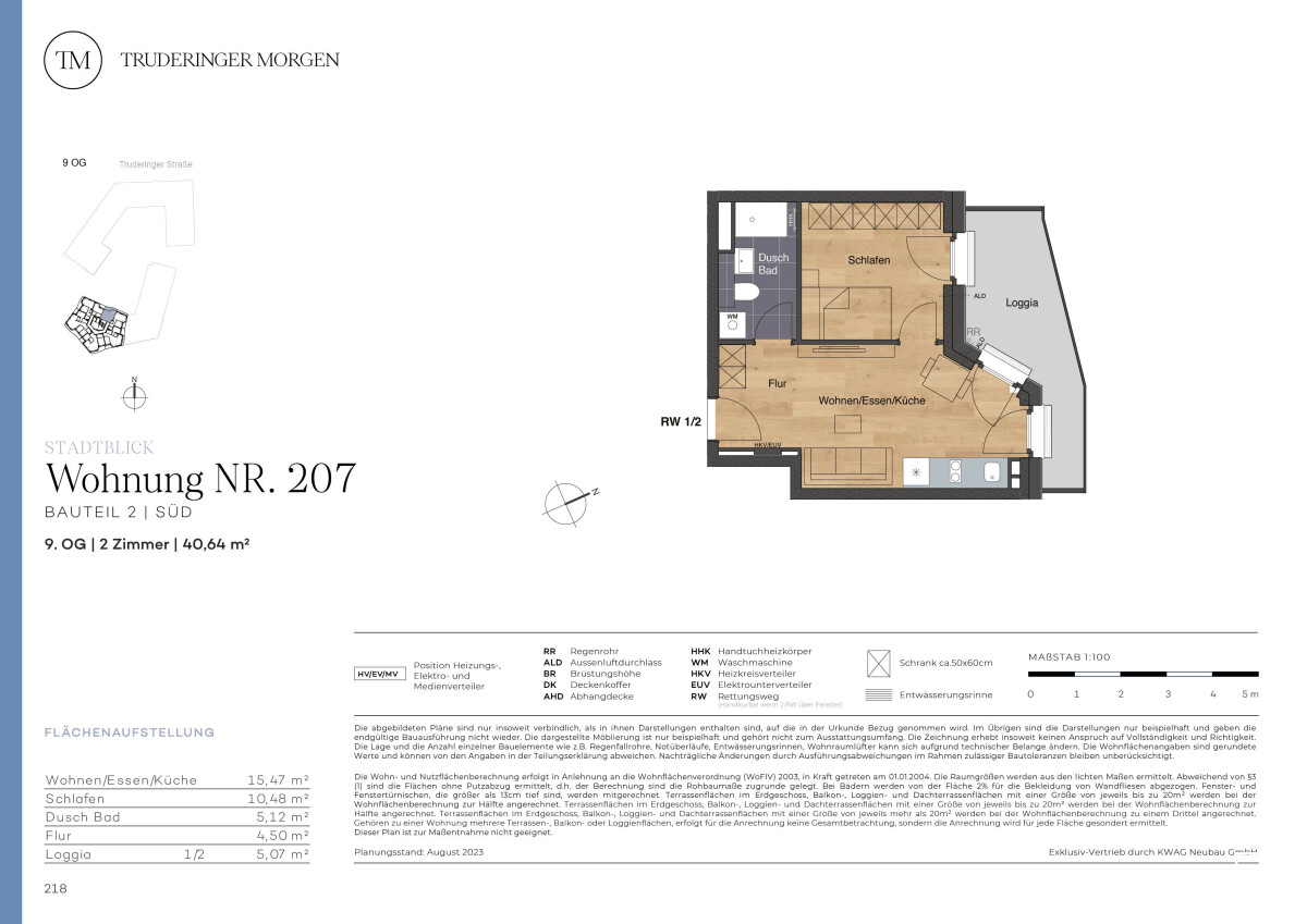 Die 2-Zimmer-Neubauwohnung befindet im 9. OG des Truderinger Morgen. In diesem schönen Objekt erwartet Sie ca. 40,64 m² modernster und nachhaltiger Wohnkomfort. Die 2-Zimmer-Wohnung ist auch gut als Kapitalanlage geeignet. Der Flur bietet Platz für Einbauschränke und führt in den offenen Wohn- und Essbereich. Dieser bietet zwei Zugänge zur anschließenden Loggia. Auch das Schlafzimmer verfügt über einen Austritt auf die schöne Loggia, welche sogar bei schlechtem Wetter die Möglichkeit bietet, frische Luft zu genießen. Im Duschbad erwarten Sie eine bodengleiche Dusche, ein Handtuchheizkörper, Markenausstattung sowie großformatige Fliesen. Bei der Materialauswahl des Objekts wurde besonderer Wert auf Nachhaltigkeit gelegt. Die moderne Wohnung begeistert mit elektrischen Rollläden und Fußbodenheizung. Gestalten Sie Ihr neues Heim im prosperierenden Münchener Osten mit perfekter Verkehrsanbindung und optimaler Infrastruktur für Arbeitsalltag und Freizeitgestaltung. Ergänzt wird der hohe Wohnkomfort mit ressourcenschonenden Technologien wie Photovoltaik und einem Mieterstrommodell.OBJEKT