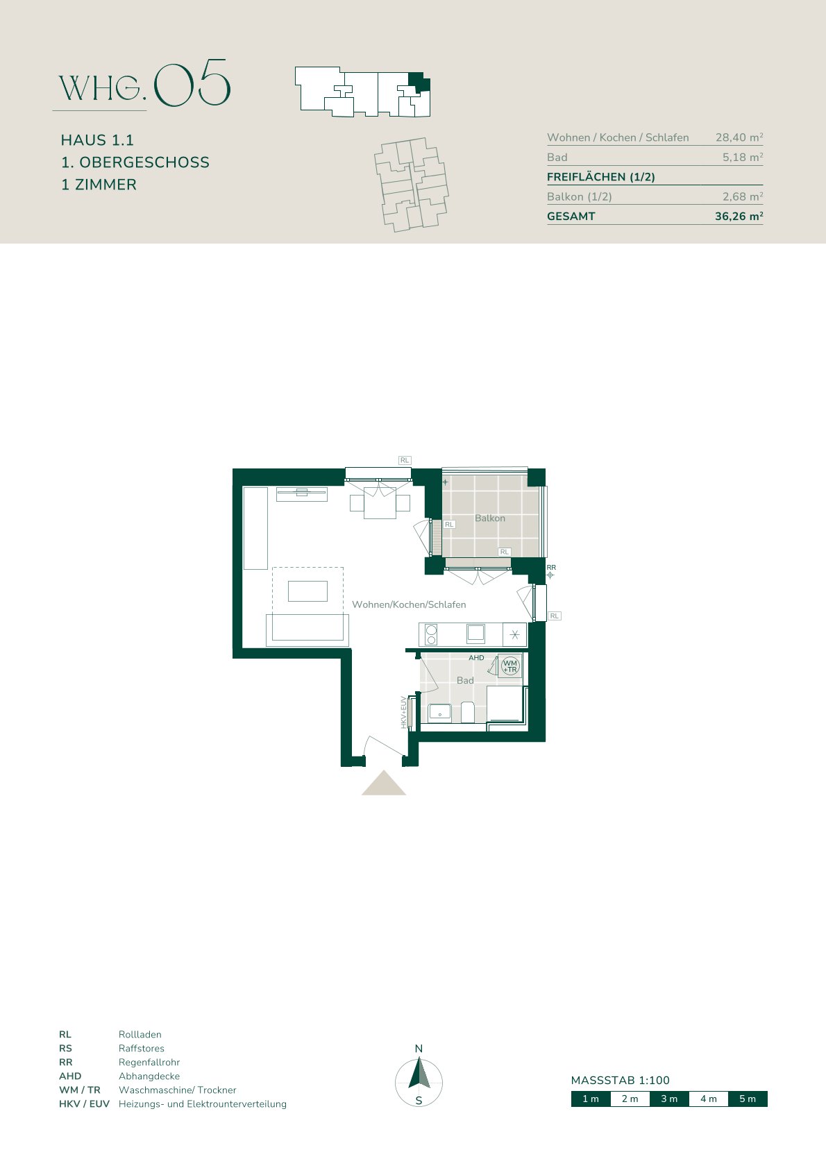 Mit 36,26 m² Wohnfläche bietet diese effizient geschnittene 1-Zimmer-Wohnung im 1. Obergeschoss einen idealen Grundriss für Singles, Young Professionals oder als solide Kapitalanlage im Neubau mit degressiver AfA-Möglichkeit.