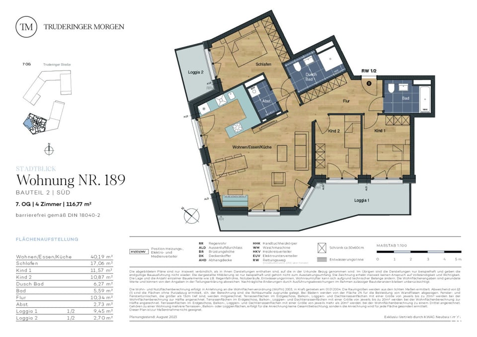 Diese barrierefreie 4-Zimmer-Neubauwohnung befindet sich im 7. OG des Neubauprojekts Truderinger Morgen und erstreckt sich auf ca. 116,77 m². Alle Zugänge und die Wohnung selbst sind barrierefrei gestaltet. Das Entree der Wohnung bildet ein geräumiger Flur mit Türen zu den beiden Kinderzimmern und dem Wannenbad. Optional kann hier auch eine barrierefreie Dusche gebaut werden. Weiter gelangen Sie in den offenen Wohn-, Ess- und Kochbereich der Wohneinheit mit großen Fenstern und Zugängen zur großen, ersten Loggia. Über einen weiteren Zugang gelangen Sie in das Duschbad, einen Abstellraum mit Waschmaschinenanschluss sowie das Schlafzimmer mit eigener, zweiter Loggia. Echtholzparkett im Wohnbereich, große Fliesen in den Bädern, elektrische Rollläden, Fußbodenheizung und Tiefgaragenstellplätze mit optionaler E-Ladestation sind nur einige der Vorzüge für den hochwertigen Wohnraum. Ergänzt wird der hohe Wohnkomfort mit einer optimalen Anbindung und einer ausgezeichneten Infrastruktur für Alltag und Freizeit inmitten des modernen, urbanen Flairs des aufstrebenden Stadtteils im Münchner Osten.