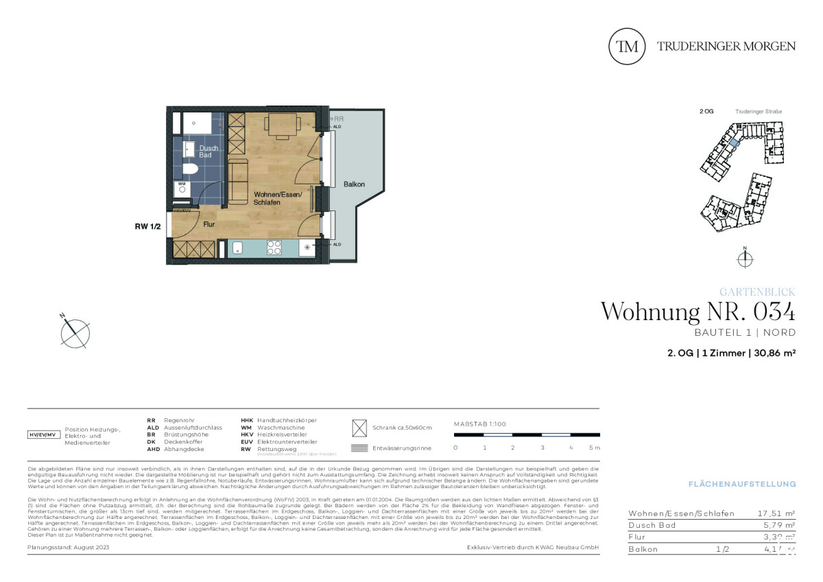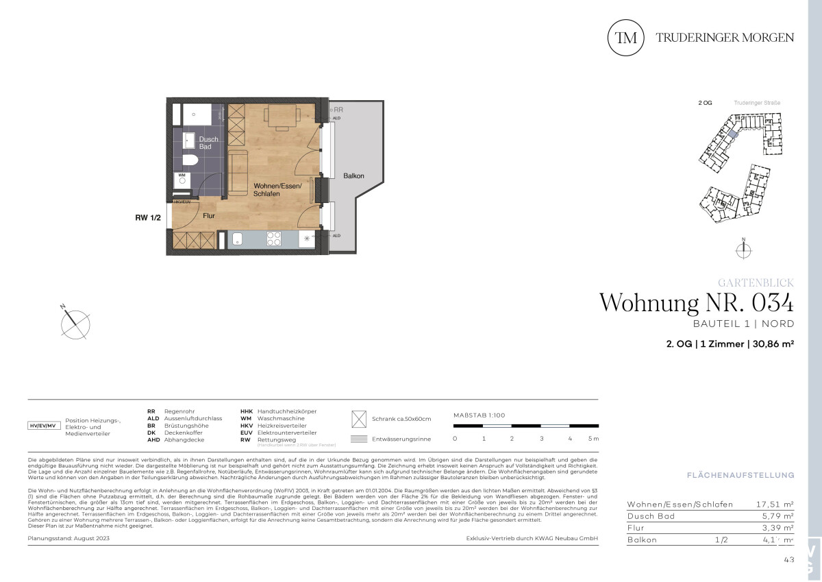 Die 1-Zimmer-Wohnung mit ca. 30,86 m² Wohnfläche und großem Balkon befindet sich im 2. OG des Neubauprojekts Truderinger Morgen. Die Räume sind optimal geschnitten und bieten viel Platz zum Wohlfühlen. Die Wohnung besticht durch ihre SO-Ausrichtung sowie ausreichend Helligkeit, geschaffen durch die große Fensterfront. Echtholzparkett im Wohnbereich, große Fliesen im Duschbad, elektrische Rollläden, Fußbodenheizung und Tiefgaragenstellplätze mit optionaler E-Ladestation sind nur einige der Vorzüge für den hochwertigen Wohnraum. Ergänzt wird der hohe Wohnkomfort mit einer optimalen Anbindung und einer ausgezeichneten Infrastruktur für Alltag und Freizeit inmitten des modernen, urbanen Flairs des aufstrebenden Stadtteils im Münchner Osten.