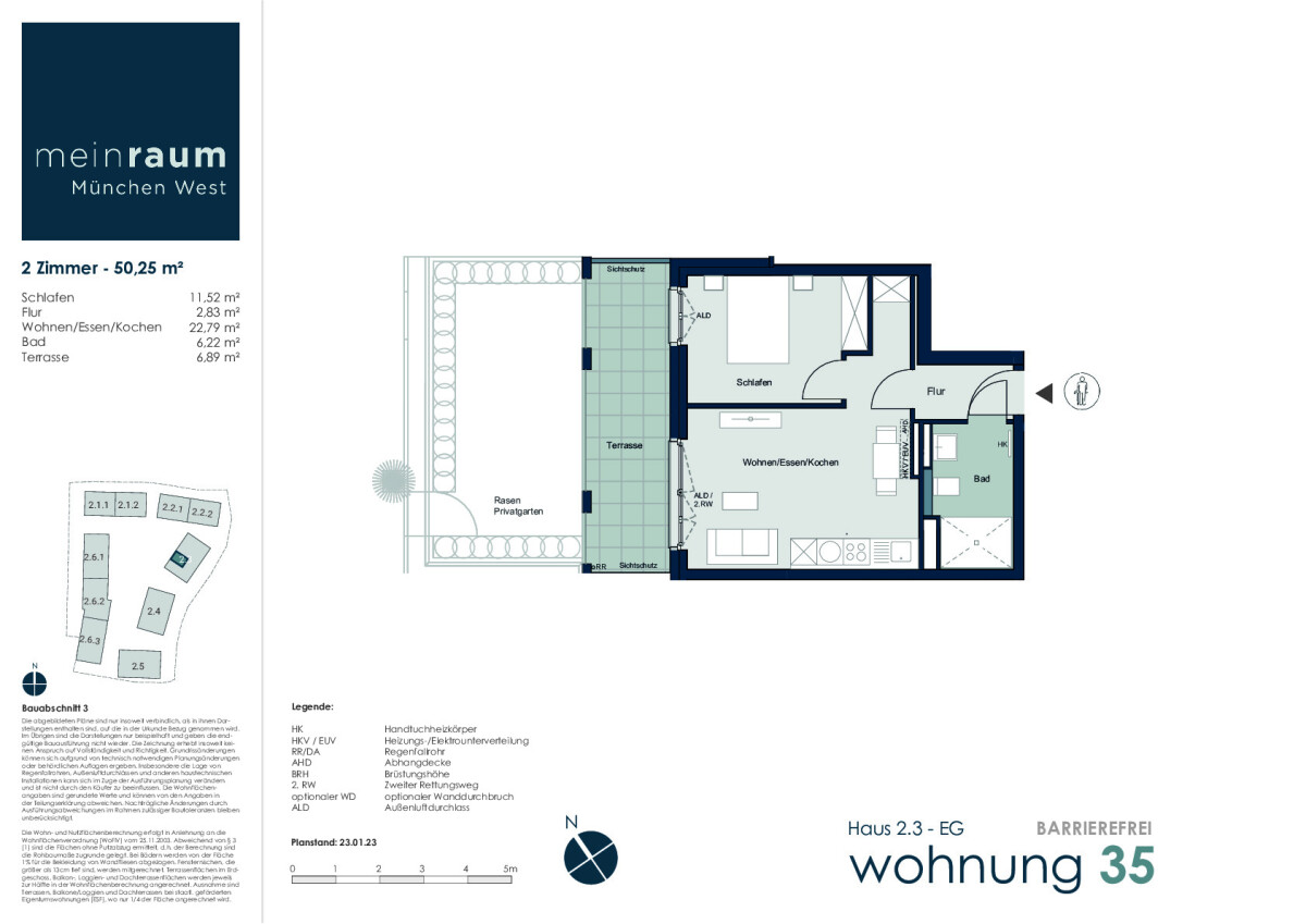 Suchen Sie ein Heim mit modernem Ambiente oder ein kleines Wohlfühlparadies mit lichtdurchfluteten Zimmern? Die stilvollen Eigentumswohnungen im Stadtquartier meinraum München West warten geradezu darauf, dass ihnen anspruchsvolle Bewohner Leben einhauchen. Diese optimale 2-Zimmer-Wohnung mit großzügiger Terrasse befindet sich im Erdgeschoss einer neuen, attraktiven Wohnanlage. In diesem schönen Objekt erwartet Sie 50,25m² modernster Wohnkomfort. Mit eleganten Landhaus-Dielen in sämtlichen Wohnbereichen und großformatigen Feinsteinzeug-Fliesen zur Fußbodenheizung werden Wohnträume wahr. Im Aussenbereich lädt die schöne Terrasse zum Verweilen ein.