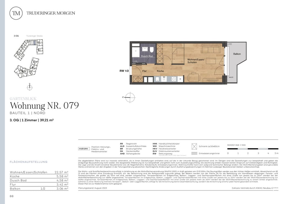 Die 1-Zimmer-Wohnung misst ca. 39,21 m², liegt im 3. OG und befindet sich im Neubauprojekt Truderinger Morgen, im Osten von München. Durch den großzügigen Flur mit angrenzender Küchenzeile gelangen Sie in den hellen Wohn- und Essbereich. Der Schlafbereich ist dabei optisch vom Rest abgetrennt. Durch die große Fensterfront, die für Helligkeit sorgt, erreichen Sie den Balkon mit Südausrichtung. Das Duschbad ist mit einem Handtuchheizkörper, großformatigen Fliesen, hochwertigen Sanitärartikeln und Markenarmaturen ausgestattet. Im Wohnbereich erwarten Sie Echtholzparkett und Fußbodenheizung. Die Wohneinheit ist eine sehr gute Kapitalanlage in München.OBJEKT