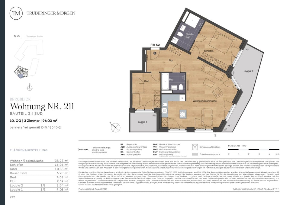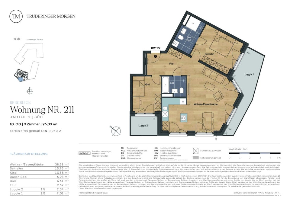 Das Neubauprojekt Truderinger Morgen steht für modernen Komfort und nachhaltiges Wohnen. Die barrierefreie 3-Zimmer-Wohnung mit zwei Loggien im 10. OG erstreckt sich auf ca. 96,03 m². Die Wohnung bietet einen einmaligen Blick bis hin zu den Alpen. Mit elegantem Echtholzparkett in den Wohnbereichen sowie großformatigen Fliesen in den Bädern werden Wohnträume wahr. Vom Eingang aus betreten Sie den großzügigen und einladenden Flur mit Platz für Einbauschränke oder eine Garderobe. Ebenfalls erreichen Sie hier das Kinderzimmer mit Zugang zur kleinen Loggia sowie das Wannenbad. Der großzügige Wohn-, Ess- und Kochbereich ist offen und hell gestaltet und verfügt über zwei Zugänge zur Süd-Loggia. Das Schlafzimmer überzeugt durch ein Duschbad en Suite. Die gesamte Wohnung ist dabei barrierefrei und die Materialauswahl ist hochwertig sowie schadstoffarm. Ergänzt wird der hohe Wohnkomfort mit einer ausgezeichneten Infrastruktur für Alltag und Freizeit inmitten des modernen, urbanen Flairs des aufstrebenden Stadtteils im Münchener Osten.