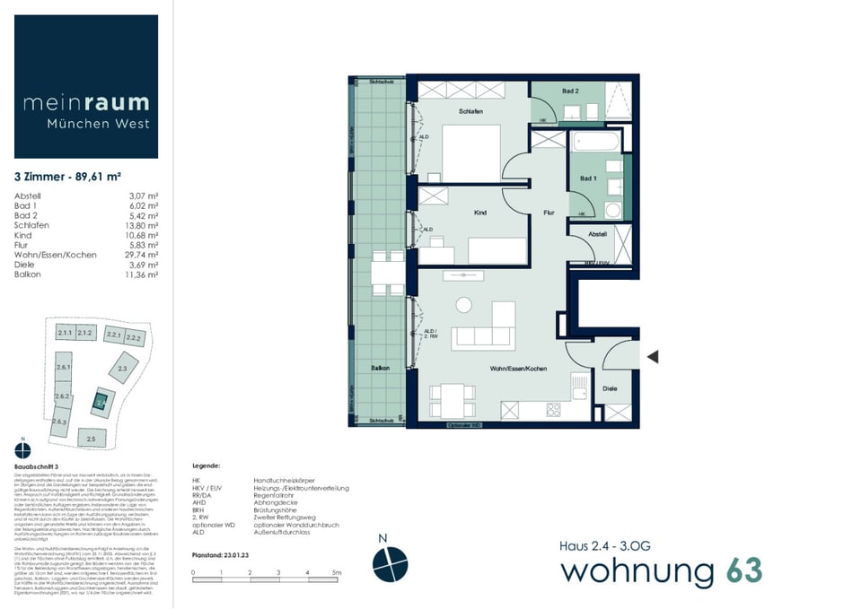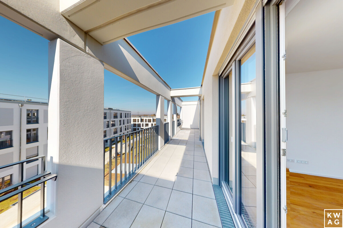 Diese praktische 3-Zimmer-Wohnung mit großem Balkon entlang der gesamten Wohnung Wohnung befindet sich im 3. OG einer neuen, attraktiven Wohnanlage. In diesem schönen Objekt erwartet Sie 89,61m² modernster Wohnkomfort. Auf dem gemütlichen Balkon können Sie Ihre Ruhe-Oase gestalten und den Feierabend geniessen. Großformatige Feinsteinzeug-Fliesen in den Bädern, edle Landhaus-Dielen in Eiche in sämtlichen Wohnräumen, elektrische Rollläden, Fußbodenheizung, barrierefreie Zugänge und Tiefgaragenstellplätze mit optionaler E-Ladestation sind nur einige der Vorzüge für den hochwertigen Wohnraum, den Sie in dieser neuen Eigentumswohnung vorfinden. Ergänzt wird der hohe Wohnkomfort mit einer ausgezeichneten Infrastruktur für Alltag und Freizeit inmitten des modernen, urbanen Flairs des aufstrebenden Stadtteils im Münchener Westen.