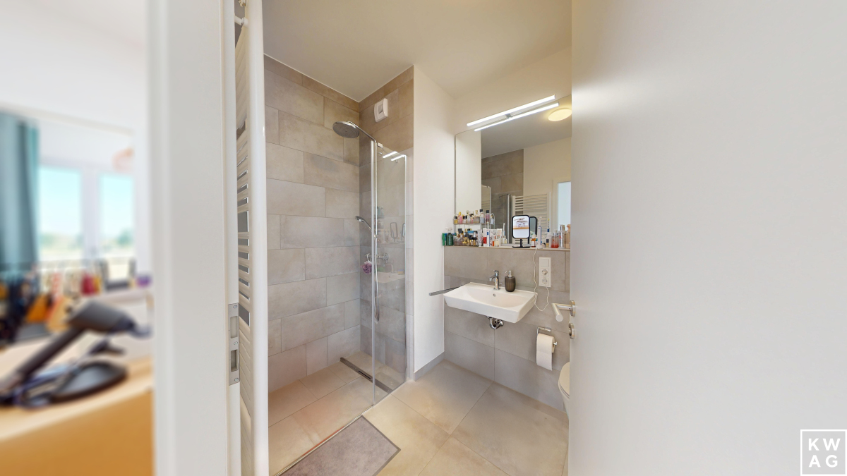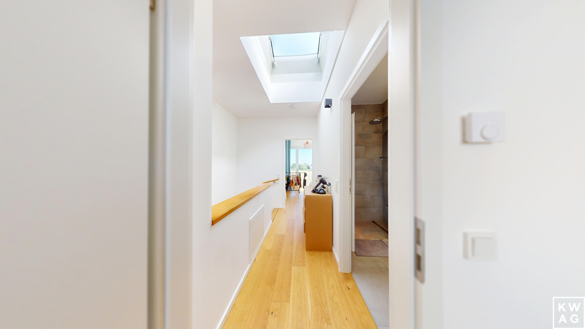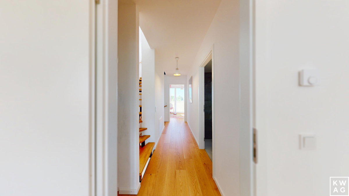Der Innenausbau überzeugt mit Echtholzparkett in den Wohnräumen, Fußbodenheizung in allen Etagen sowie einem hochwertig ausgestatteten Badezimmer mit bodentiefer Dusche und Handtuchheizkörper. Ein dezentrales Lüftungssystem mit Wärmerückgewinnung und dreifach verglaste Fenster mit elektrischen Rollläden sorgen für zeitgemäßen Wohnkomfort und Energieeffizienz.