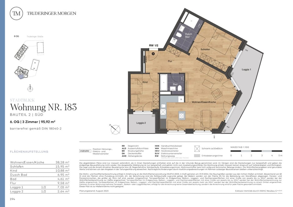 Das Neubauprojekt Truderinger Morgen steht für modernen Komfort und nachhaltiges Wohnen. Die barrierefreie 3-Zimmer-Wohnung mit zwei Loggien im 6. OG erstreckt sich auf ca. 95,92 m². Die Wohnung bietet aufgrund der niedrigen Umgebungsbebauung einen einmaligen Blick über die Stadt München. Mit elegantem Echtholzparkett in den Wohnbereichen sowie großformatigen Fliesen in den Bädern werden Wohnträume wahr. Vom Eingang aus betreten Sie den großzügigen und einladenden Flur mit Platz für Einbauschränke oder eine Garderobe. Ebenfalls erreichen Sie hier das Kinderzimmer mit Zugang zur kleinen Loggia sowie das Wannenbad. Der großzügige Wohn-, Ess- und Kochbereich ist offen und hell gestaltet und verfügt über zwei Zugänge zur Süd-Loggia. Das Schlafzimmer überzeugt durch ein Duschbad en Suite. Die gesamte Wohnung ist dabei barrierefrei. Die Materialauswahl ist hochwertig und schadstoffarm. Ergänzt wird der hohe Wohnkomfort mit einer ausgezeichneten Infrastruktur für Alltag und Freizeit inmitten des modernen, urbanen Flairs des aufstrebenden Stadtteils im Münchener Osten.