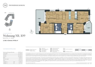 Das Neubauprojekt Truderinger Morgen steht für modernen Komfort und nachhaltiges Wohnen. Diese wunderschöne 4-Zimmer-Wohnung mit zwei Loggien im 2. OG erstreckt sich auf ca. 99,56 m². Mit elegantem Echtholzparkett in den Wohnbereichen sowie großformatigen Fliesen zur Fußbodenheizung werden Wohnträume wahr. Vom Flur aus gelangen Sie in die beiden Badezimmer sowie in den großzügigen und hellen Wohn-, Ess- und Kochbereich mit angrenzender Loggia. Die West-Loggia erreichen Sie ebenfalls über das Schlafzimmer. Ein herrlicher Blick in den Garten erwartet Sie hier. Das Badezimmer mit Badewanne, ein Schlafzimmer mit Bad en Suite, sowie ein Abstellraum sind ebenfalls vorhanden. Die beiden Kinderzimmer haben jeweils einen Zugang zur Loggia. Ergänzt wird der hohe Wohnkomfort durch Nachhaltigkeit sowie eine ausgezeichnete Infrastruktur für Alltag und Freizeit inmitten des modernen, urbanen Flairs des aufstrebenden Stadtteils im Münchener Osten.