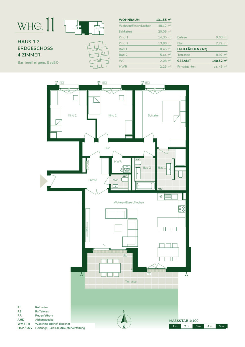 Diese großzügige 4-Zimmer-Wohnung im Erdgeschoss bietet auf ca. 140 m² Wohnfläche ein modernes und zugleich familienfreundliches Raumkonzept. Das offene Entree trennt den privaten vom gemeinschaftlichen Bereich: Links gelangen Sie über einen Flur zu zwei Kinderzimmern, einem Wannenbad, einem Hauswirtschaftsraum sowie dem Schlafzimmer mit Bad en Suite. Zusätzlich steht ein Gäste-WC im Entree-Bereich zur Verfügung.