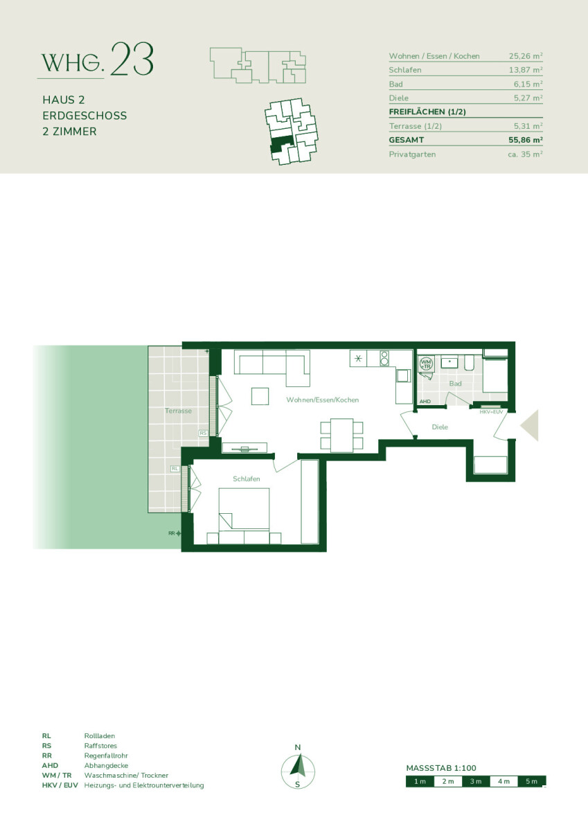 Diese hochwertig ausgestattete 2-Zimmer-Wohnung im Erdgeschoss bietet auf ca. 55,86 m² Wohnfläche ein modernes und ruhiges Wohnambiente mit direktem Zugang ins Grüne.