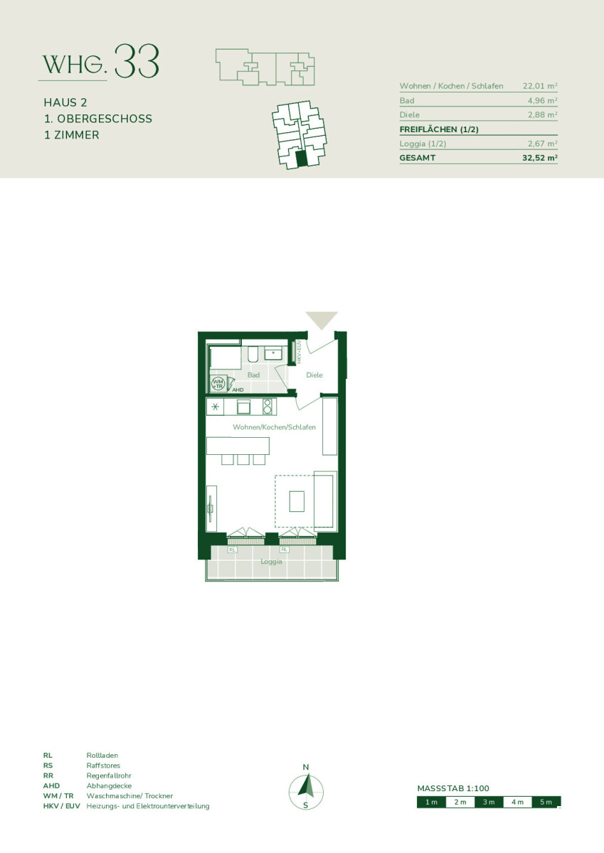 Der offen gestaltete Wohn-, Koch- und Schlafbereich wird durch zwei große Fensterfronten mit Rollläden geprägt und bietet Zugang zur Loggia, die den Wohnraum nach außen erweitert. Hochwertige Materialien, klare Linien und ein durchdachtes Raumkonzept machen diese Wohnung ideal für Eigennutzer oder als nachhaltige Kapitalanlage (5% degr. AfA).