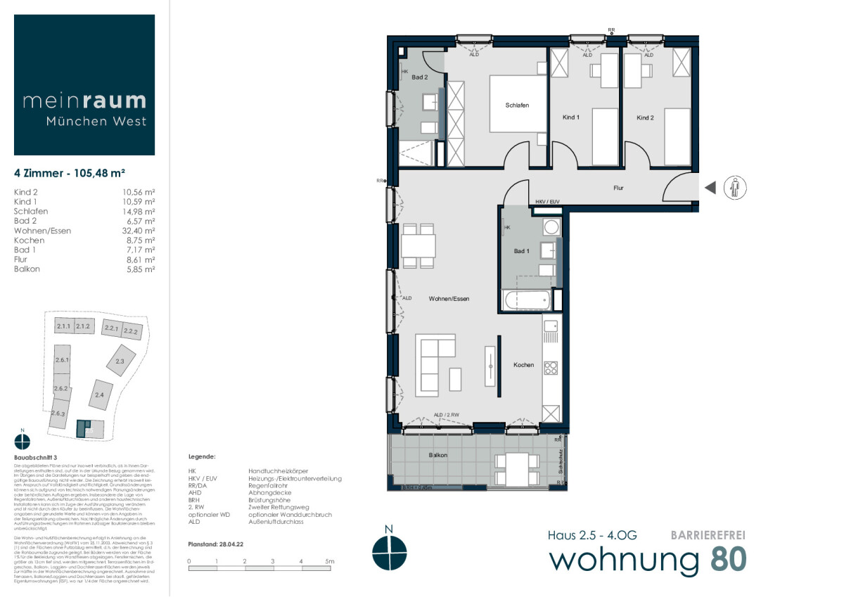 Suchen Sie ein Heim mit modernem Ambiente oder ein kleines Wohlfühlparadies mit lichtdurchfluteten Zimmern? Die stilvollen Eigentumswohnungen im Stadtquartier meinraum München West warten geradezu darauf, dass ihnen anspruchsvolle Bewohner Leben einhauchen. Die wunderschöne 4-Zimmer-Wohnung mit Süd-West Aussrichtung im 4. OG einer stilvollen Wohnanlage wird Sie begeistern. In diesem schönen Objekt erwartet Sie 105,48m² modernster Wohnkomfort. Mit eleganten Landhaus-Dielen in sämtlichen Wohnbereichen und großformatigen Feinsteinzeug-Fliesen zur Fußbodenheizung werden Wohnträume wahr. Auf dem gemütlichen Balkon können Sie Ihre Ruhe-Oase gestalten und den Feierabend geniessen.