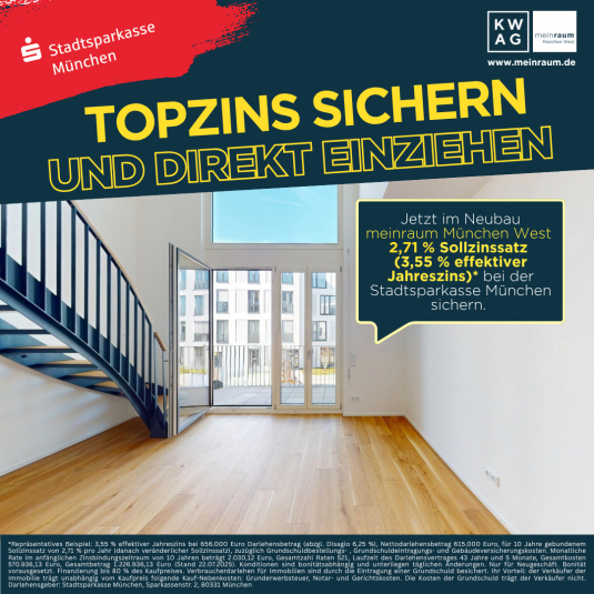 3,55 % effektiver Jahreszins bei 656.000 Euro Darlehensbetrag (abzgl. Disagio 6,25 %), Nettodarlehensbetrag 615.000 Euro, für 10 Jahre gebundenem Sollzinssatz von 2,71 % pro Jahr (danach veränderlicher Sollzinssatz), zuzüglich Grundschuldbestellungs-, Grundschuldeintragungs- und Gebäudeversicherungskosten. Monatliche Rate im anfänglichen Zinsbindungszeitraum von 10 Jahren beträgt 2.030,12 Euro, Gesamtzahl Raten 521, Laufzeit des Darlehensvertrages 43 Jahre und 5 Monate, Gesamtkosten 570.936,13 Euro, Gesamtbetrag 1.226.936,13 Euro (Stand 22.07.2025). Konditionen sind bonitätsabhängig und unterliegen täglichen Änderungen. Nur für Neugeschäft. Bonität vorausgesetzt. Finanzierung bis 80 % des Kaufpreises. Verbraucherdarlehen für Immobilien sind durch die Eintragung einer Grundschuld besichert. (Stand: 27.07.2025) Darlehensgeber: Stadtsparkasse München, Sparkassenstr. 2, 80331 München
